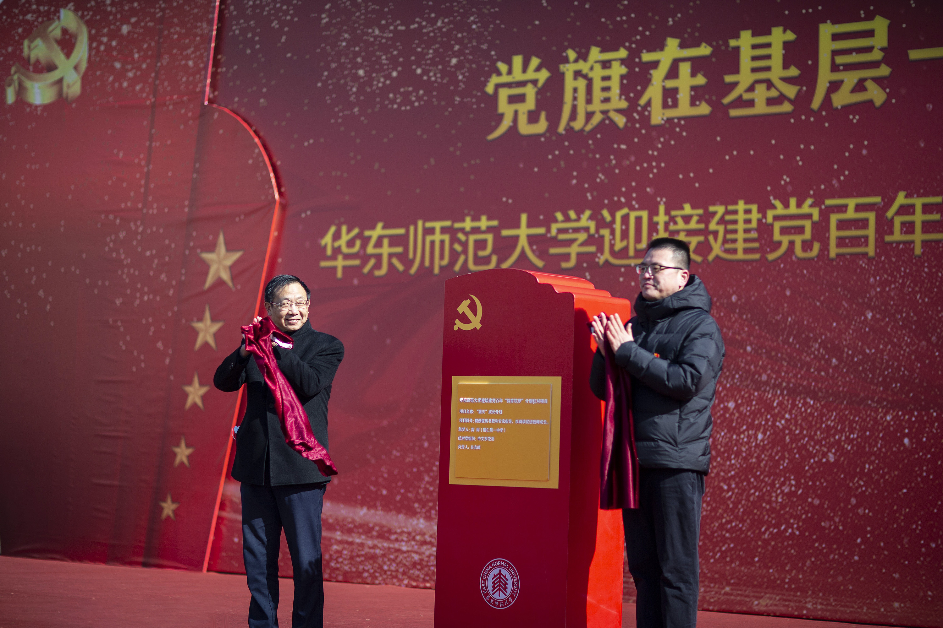 校党委副书记、纪委书记曹友谊,教师代表吕志峰揭幕“教育筑梦”结对项目