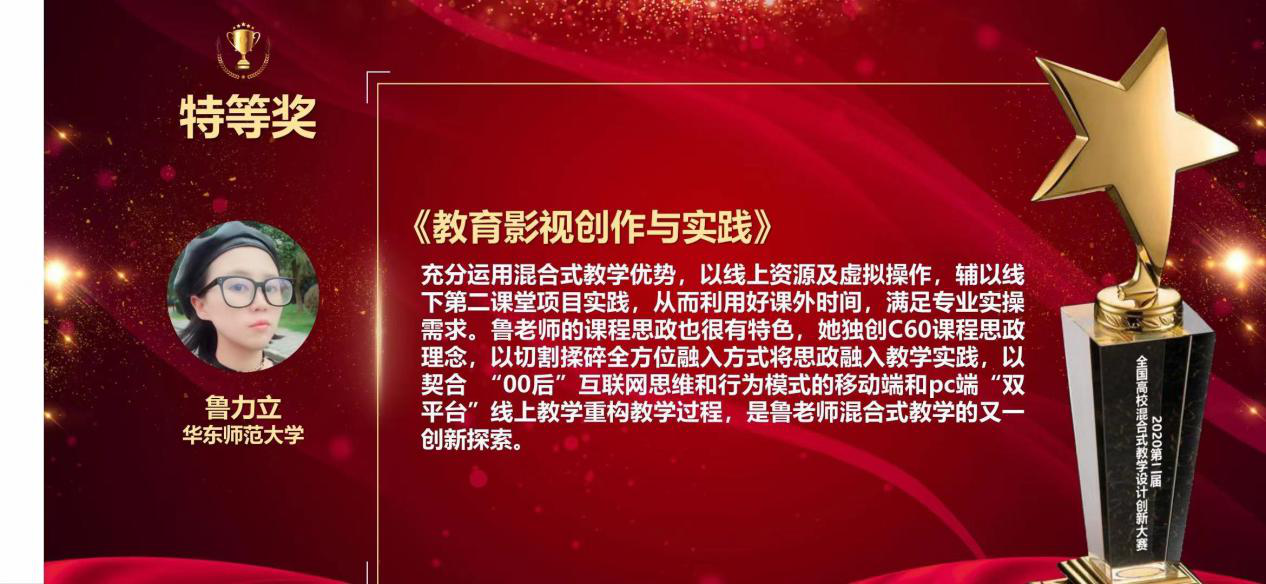教育学部鲁力立老师《教育影视创作与实践》课程获得特等奖。该课程以混合式教学方案解决实验学时不足但学生需要大量实践才能掌握充分专业实践能力的矛盾;创新性开辟移动和pc端“双平台”“针对性”在线教学,丰富的教学手段和技术转化原传统课堂教学任务特别是互动型实验讨论任务等,不仅保质保量完成教学目标,甚至超越了以往传统课堂的教学效果;并将课程思政理念切割揉碎全方位融入线上线下教学实践过程中。