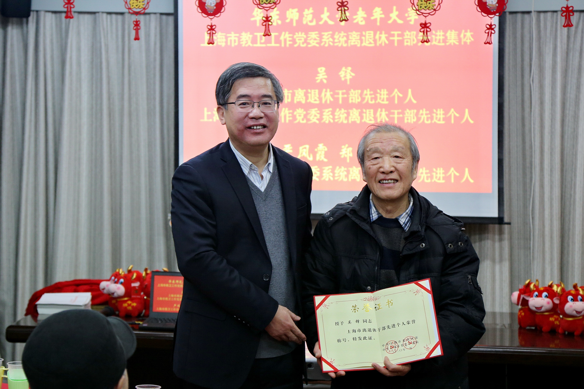 随后,朱民致辞,向上海市离退休干部先进个人吴铎同志和市教卫党委工作系统离退休干部先进集体完美(中国)官方老年大学颁发证书和奖牌;并为属牛的老同志佩戴红围巾,祝福老同志幸福快乐,健康长寿。