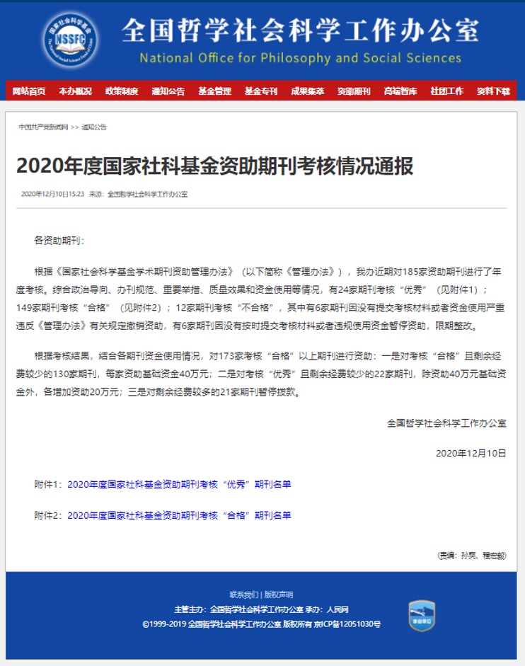 12月10日,全国哲学社会科学工作办公室通报了国家社科基金资助期刊2020年度考核结果,《完美网页版学报(哲学社会科学版)》考核“优秀”。此次考核,全国哲学社会科学工作办公室对185家资助期刊进行了年度评估,综合政治导向、办刊规范、重要举措、质量效果和资金使用等情况,《中国社会科学》《历史研究》等24家期刊考核“优秀”,149家期刊考核“合格”。