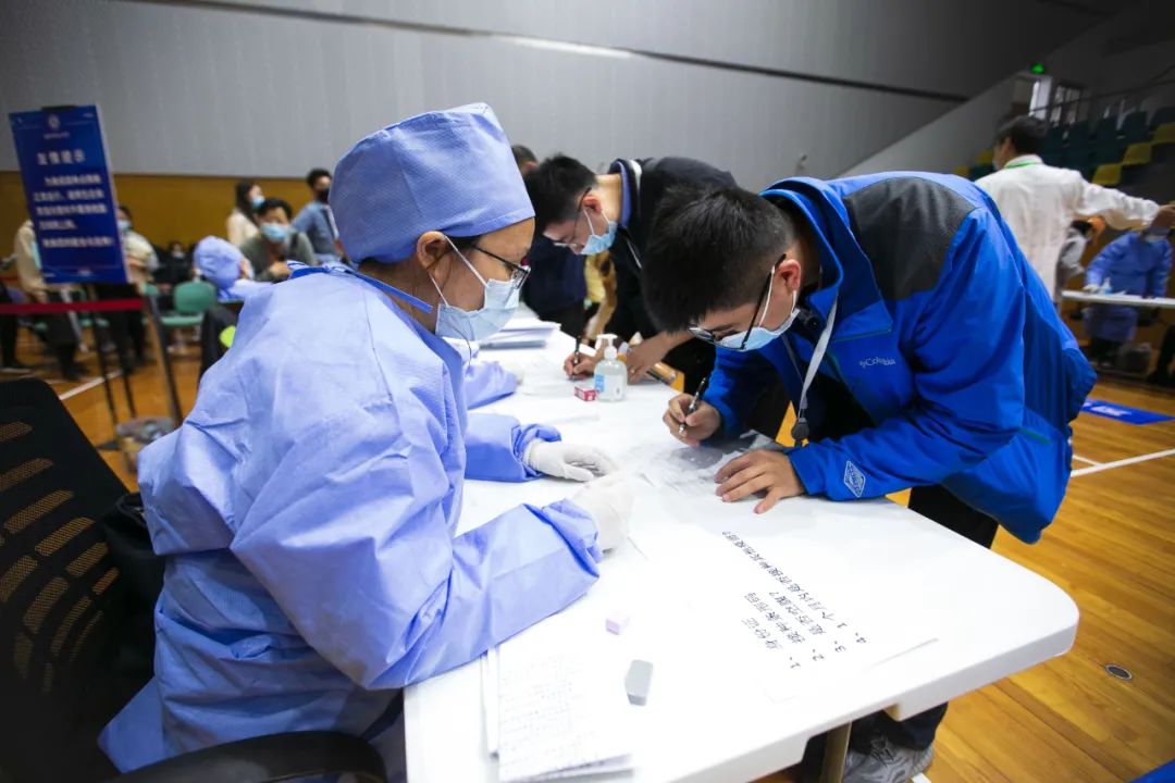 本次疫苗接种场地分为:等候区、预检区、接种区、留观区,确保接种流程全过程单向不反复。在两校区体育馆,同学们依次排队等候,在入口处经过体温检测和查验随申码后进场。在预检区医务人员对师生进行健康问询、禁忌筛查、签署知情同意书。师生有序刷卡前往候种区,在疫苗接种区,进行身份核验、疫苗接种。完成接种后,来到留观区观察,留观30分钟后无不适症状,待医务人员查验留观提示卡后便可离开。