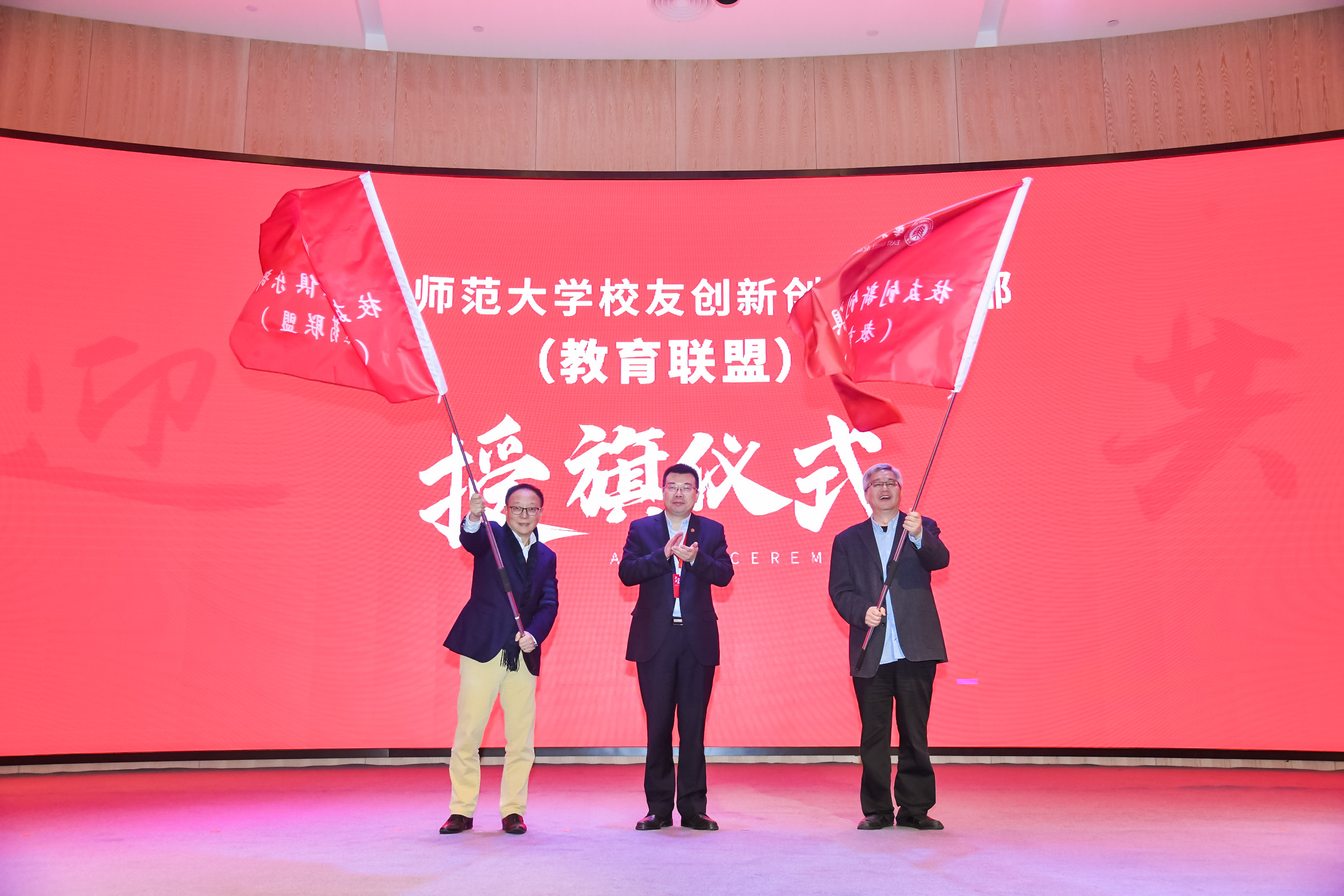 副校长孙真荣向校友双创俱乐部教育联盟主席田培庆、生物医药联盟主席鲁白授旗
