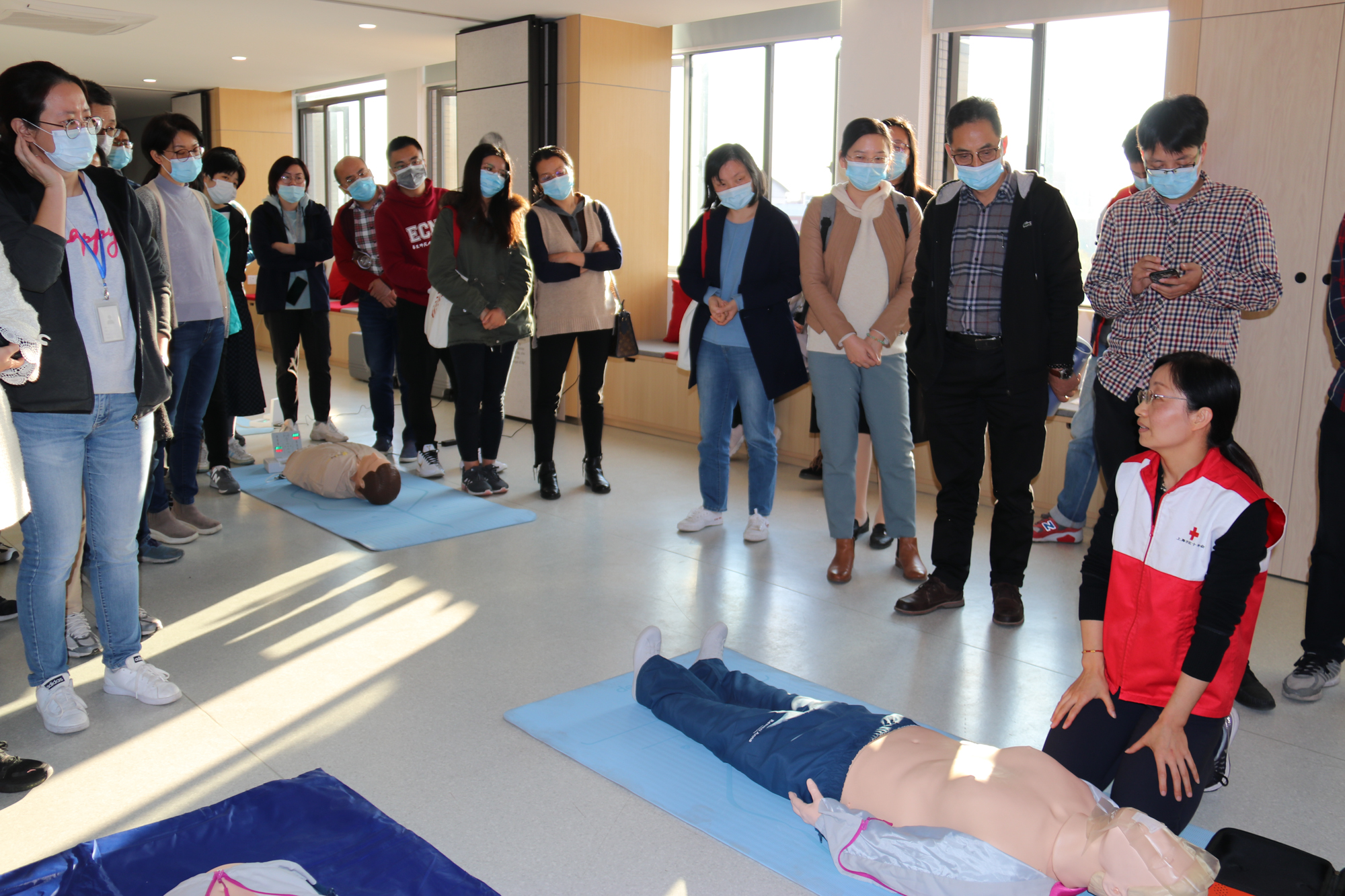 上海市红十字会周霞老师现场演示心肺复苏、人工呼吸、体外除颤以及创伤救护的方法与技巧,帮助安全员掌握急救知识,提升对紧急事故的处置能力。