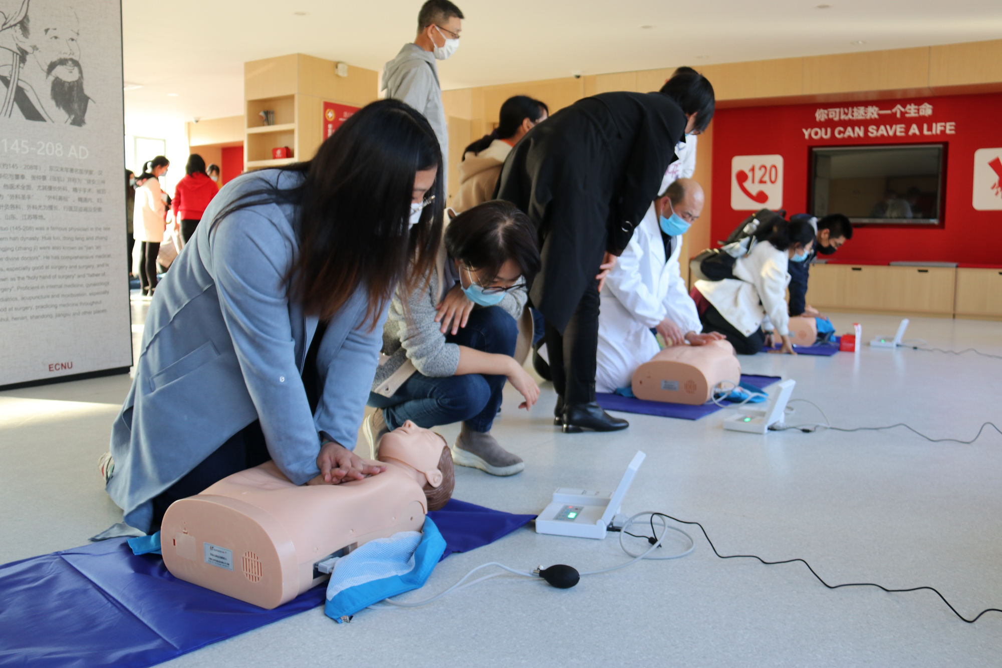 红十字会周霞医生演示心肺复苏(左)、安全员现场学习体验