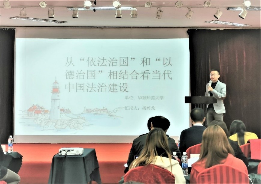 法学院杨兴龙以《从“依法治国”和“以德治国”相结合看当代中国法治建设》为主题,从清朝大学士张英与邻居的“六尺巷”故事出发,对“法治”与“德治”的概念进行了梳理,结合改革开放以来党和国家有关法治与德治的理论发展,阐述了“依法治国”和“以德治国”相结合才是中国特色社会主义道路的重要保障。