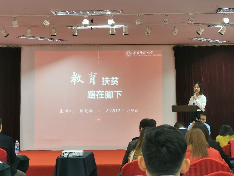 教师教育学院韩笑梅以《教育扶贫,路在脚下》为题,介绍了新中国的脱贫史,展示了十八大以来脱贫攻坚的巨大成就,阐述了精准扶贫的基本方略和教育扶贫的重要意义,并通过第一书记黄文秀反哺家乡的动人事迹,呼吁广大青年投身脱贫攻坚的伟大事业。