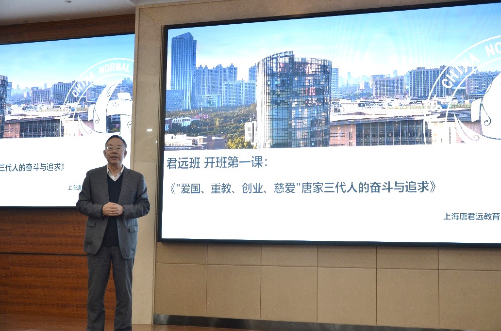 最后,上海唐君远教育基金会金同康秘书长为“君远班”的学员们带来了主题为《爱国、重教、创业、慈爱唐家三代人的奋斗与追求》开营第一课,同学们对上海唐君远教育基金会的起源、发展以及基金会的文化育人理念有了深刻的理解。他鼓励同学们,要继续弘扬和学习唐氏家族爱国重教的精神和慈善、仁爱、回报社会等优良品格,志存高远,脚踏实地,投身到符合国家社会经济发展的事业中去。
