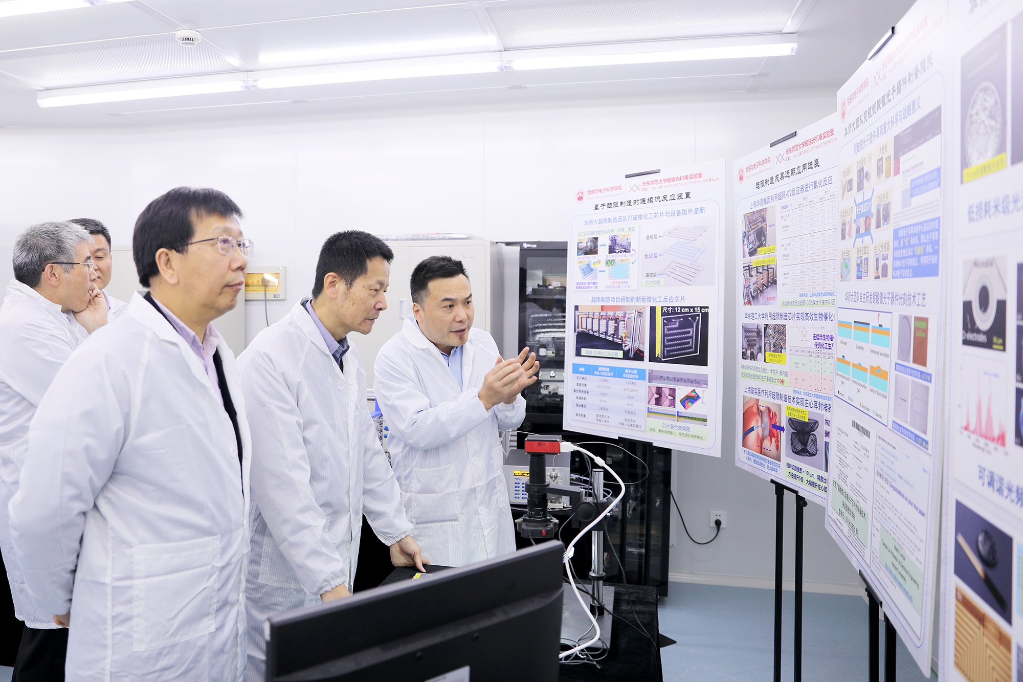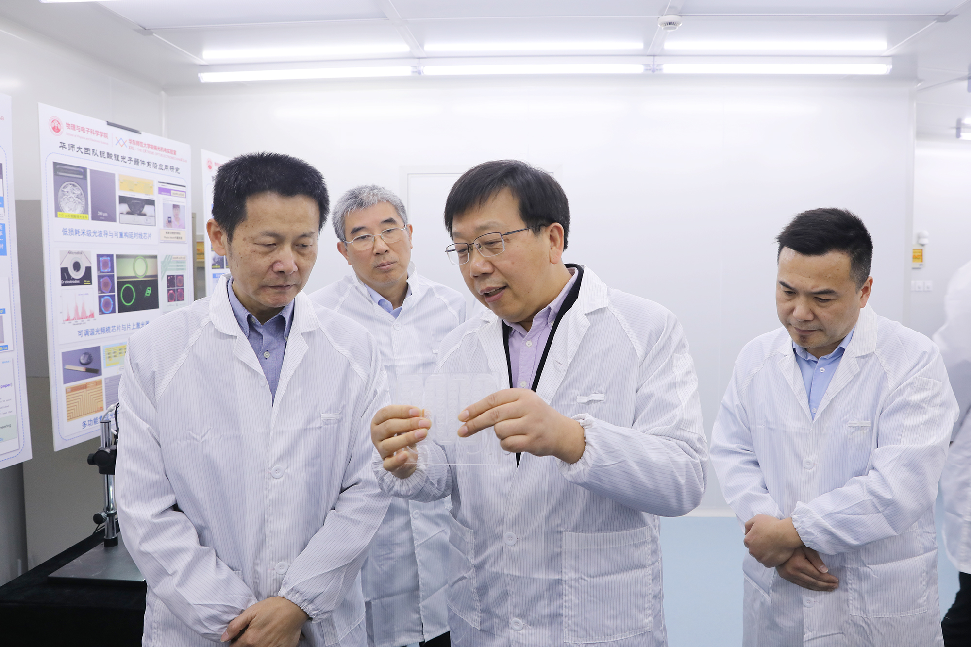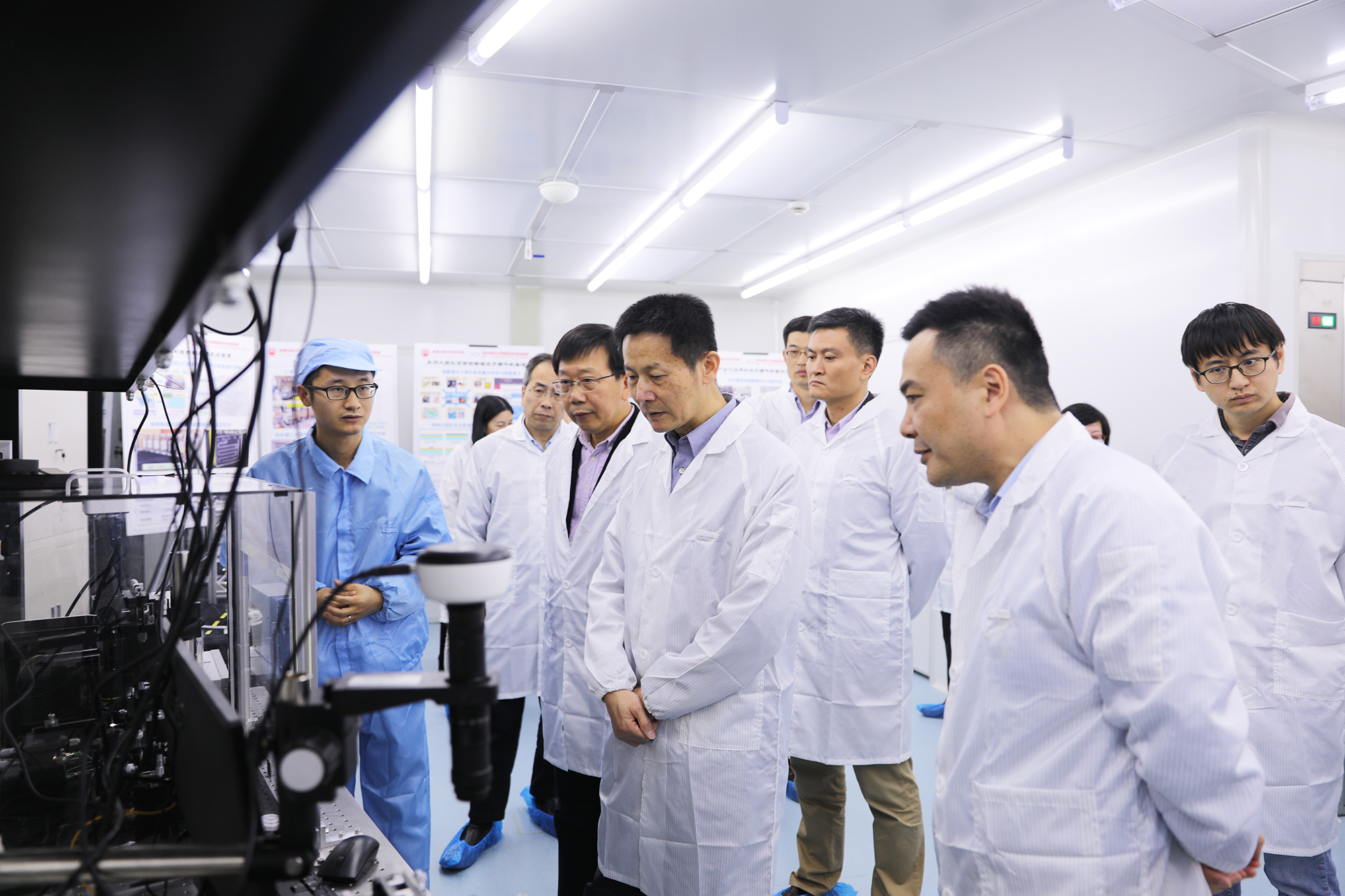 吴清副市长一行首先参观了物理与电子科学学院极端光机电实验室,考察了上海市市级重大专项“超限制造”项目的近期实施进展与铌酸锂光子芯片制备创新成果,听取了课题组汇报。