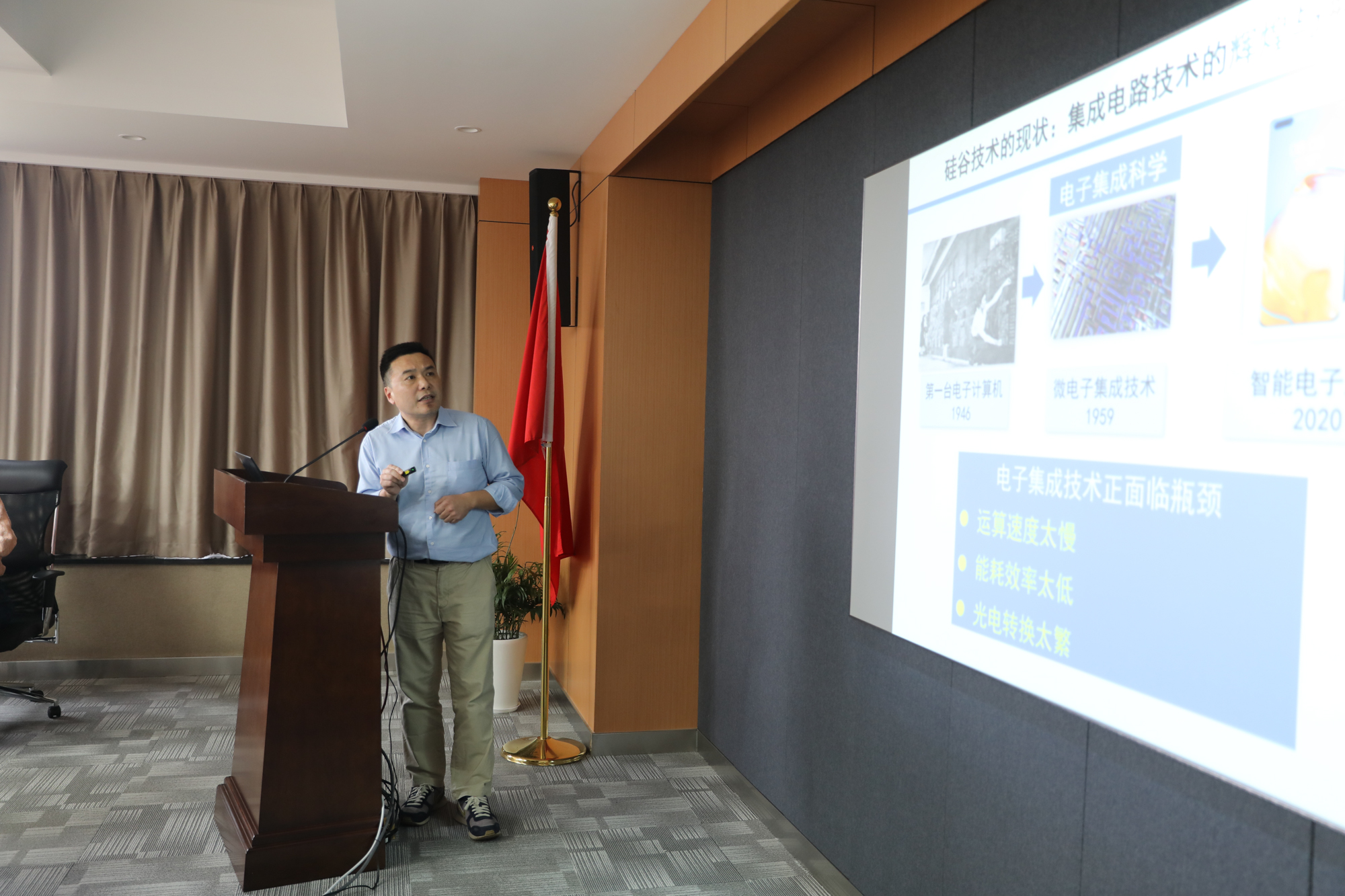 物理与电子科学学院院长程亚汇报了完美(中国)官方团队在铌酸锂光子芯片方面的最新研究进展,他特别强调光子集成技术将成为未来信息社会的赋能技术,团队将加快整合校内外相关资源,围绕产业需求,加快基础科学研究与技术攻关。