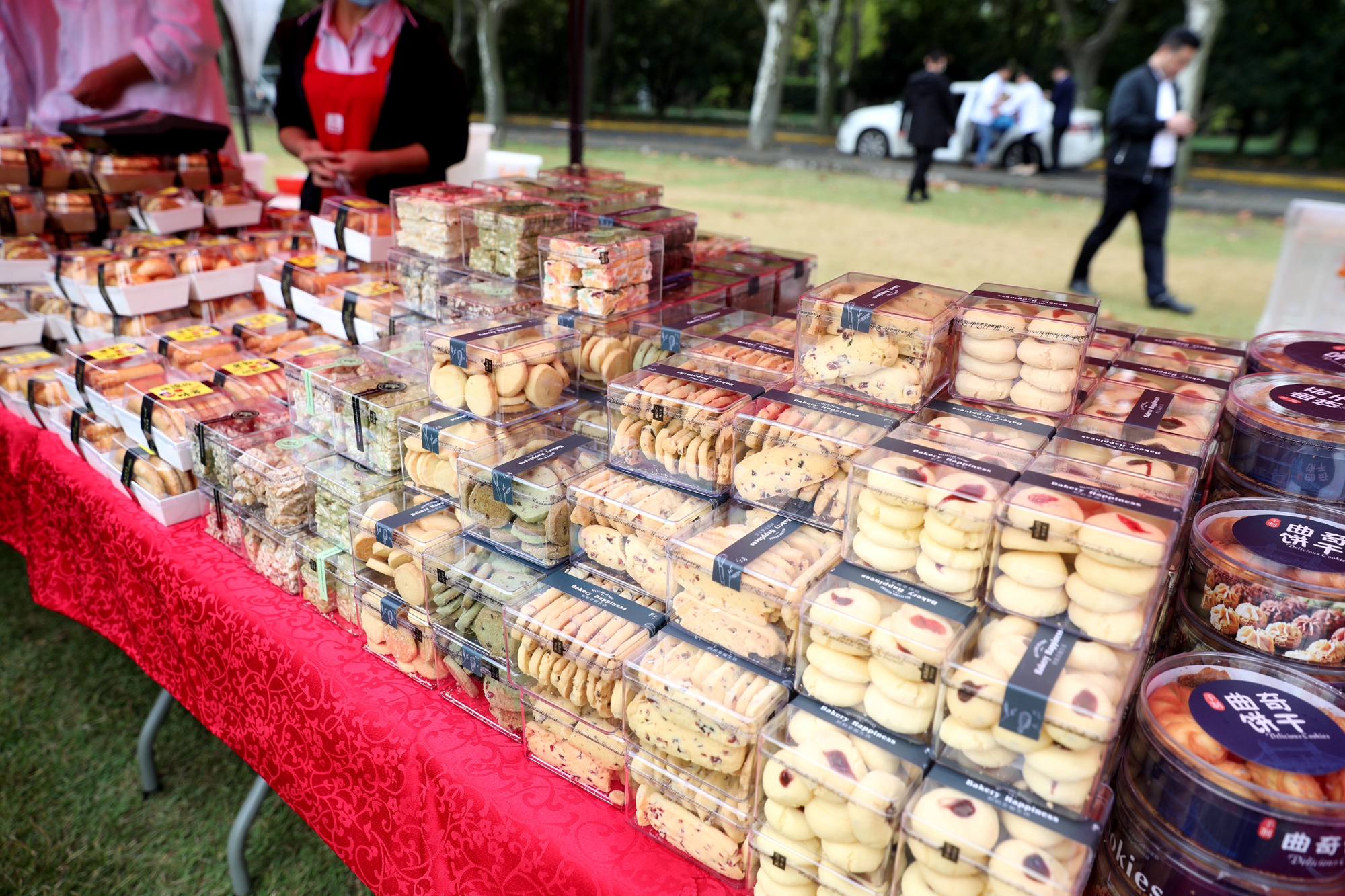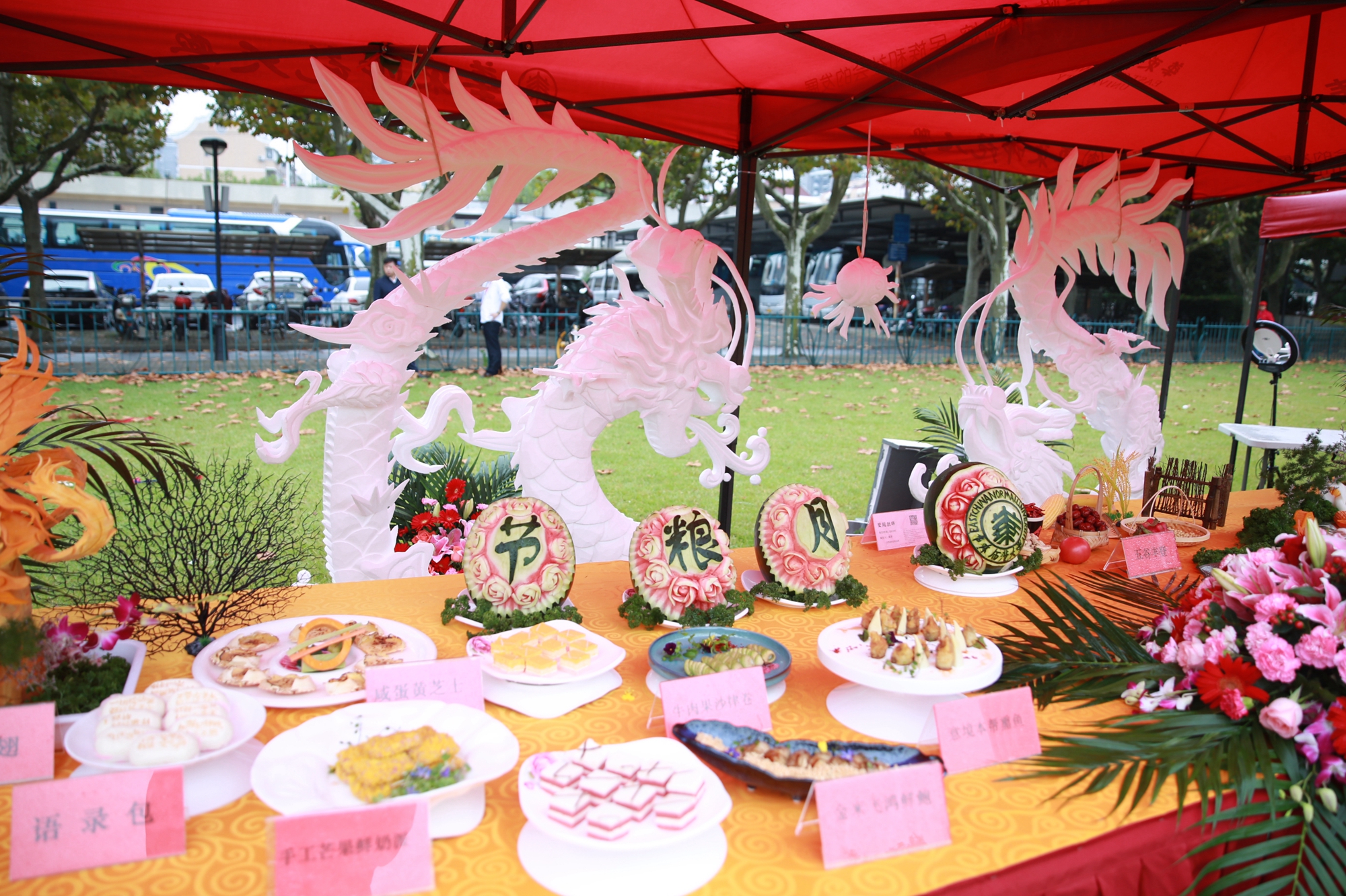 “人未到,食先备”,上午10点半,各部门已早早做好了准备,在工作台上摆好了琳琅满目的美食,有饱满料足的中式糕点、有色泽诱人的西式点心、有色香味俱佳的营养菜肴、有新鲜实惠的当季蔬果。师生们不仅可以吃到膳食服务中心(1)的比利时巧克力、虎皮卷、巧克力泡芙、苏北肉圆,还可以吃到膳食服务中心(2)的开胃小木耳、广式叉烧、榴莲酥;不仅可以品尝到秋林阁的蝴蝶酥、椒盐酥饼、酒酿糕、去骨凤爪,还可以品尝到中快餐饮的绿豆糕、拿破仑、肉松酥条、卤水鸭翅;不仅可以试试象郡餐饮的水果捞新品,还能试试清真食堂的椒麻鸡和肉夹馍。