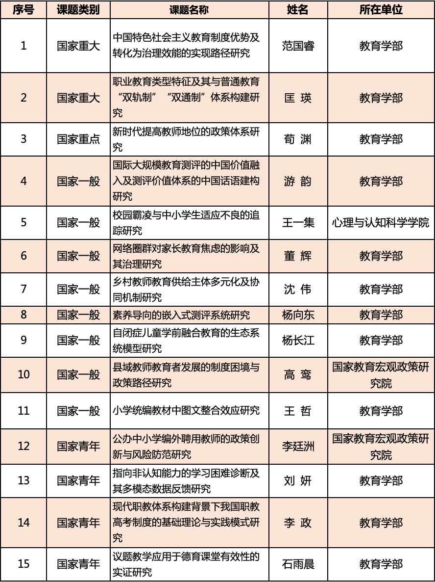在2020年度国家社科基金教育学项目立项名单中,完美(中国)官方立项总数达15项,其中国家重大重点课题共3项,一般项目8项,国家青年项目4项,立项总数全国高校排名第一。此外,还获教育部重点项目2项。
