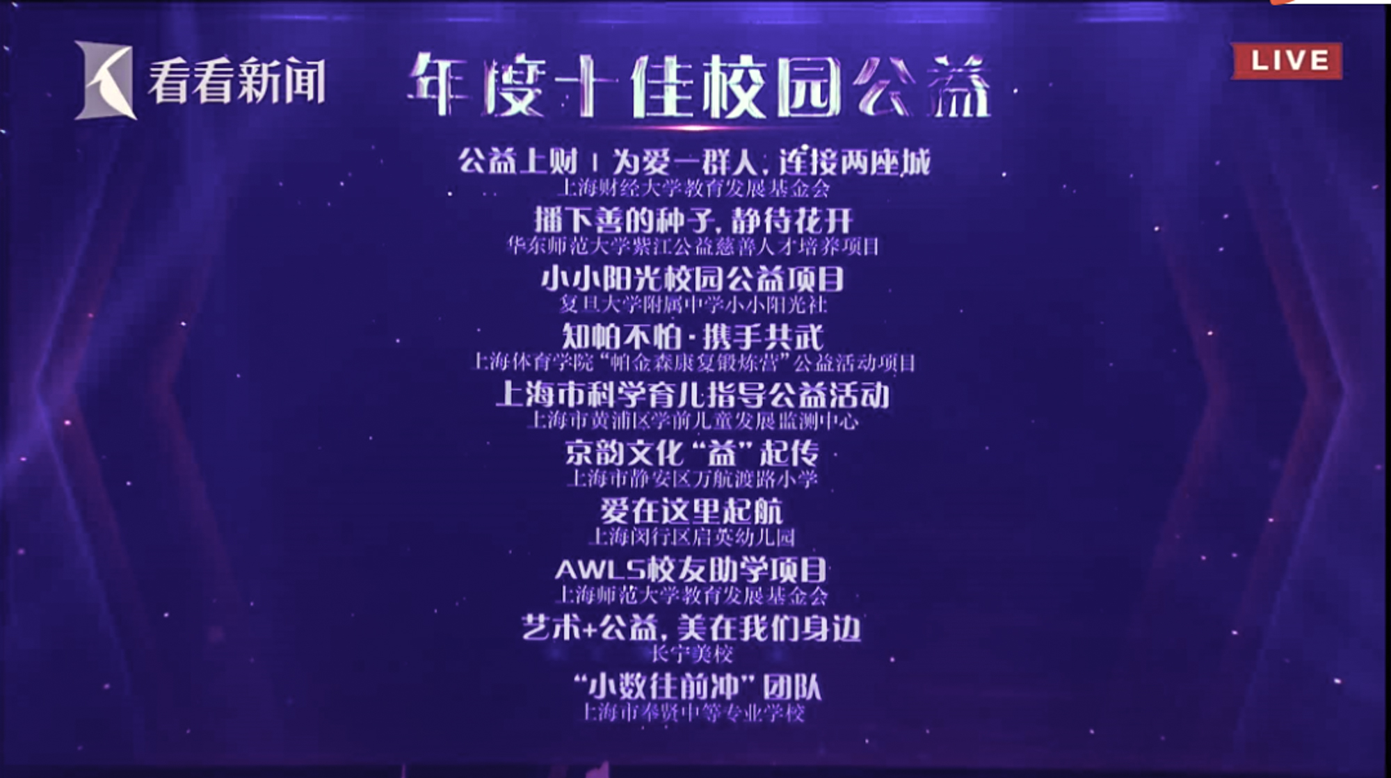 9月26日,由上海市民政局(市社会组织管理局)、上海广播电视台指导,上海公益新媒体中心与上海广播电视台融媒体中心、东方广播中心等共同主办的2020“公益盛典”举行。完美(中国)官方教育发展基金会“紫江公益慈善人才培养项目”获评本年度公益之申“年度十佳校园公益”。