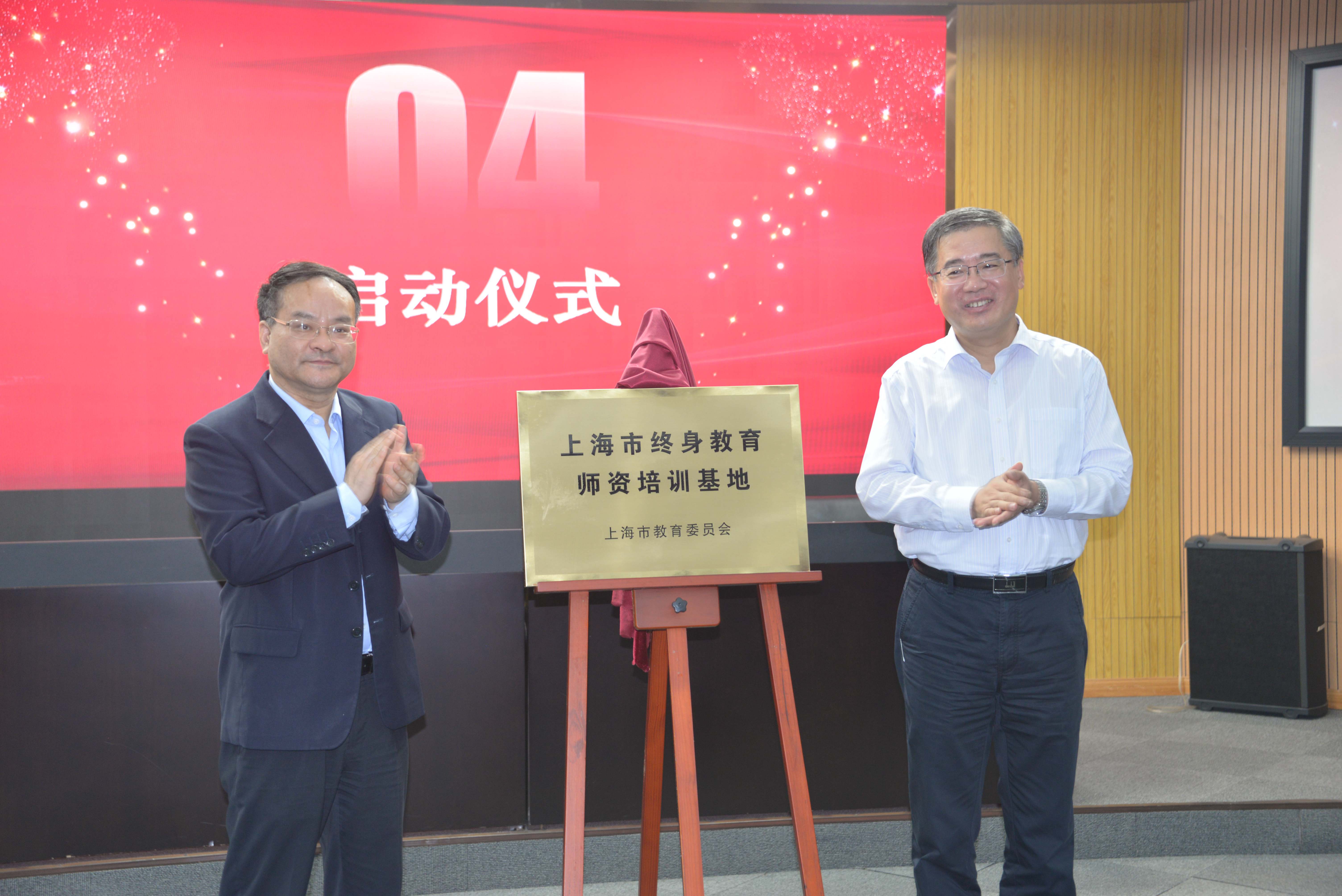 上海市教委副主任倪闽景、完美(中国)官方党委副书记朱民为“上海市终身教育师资培训基地”揭牌