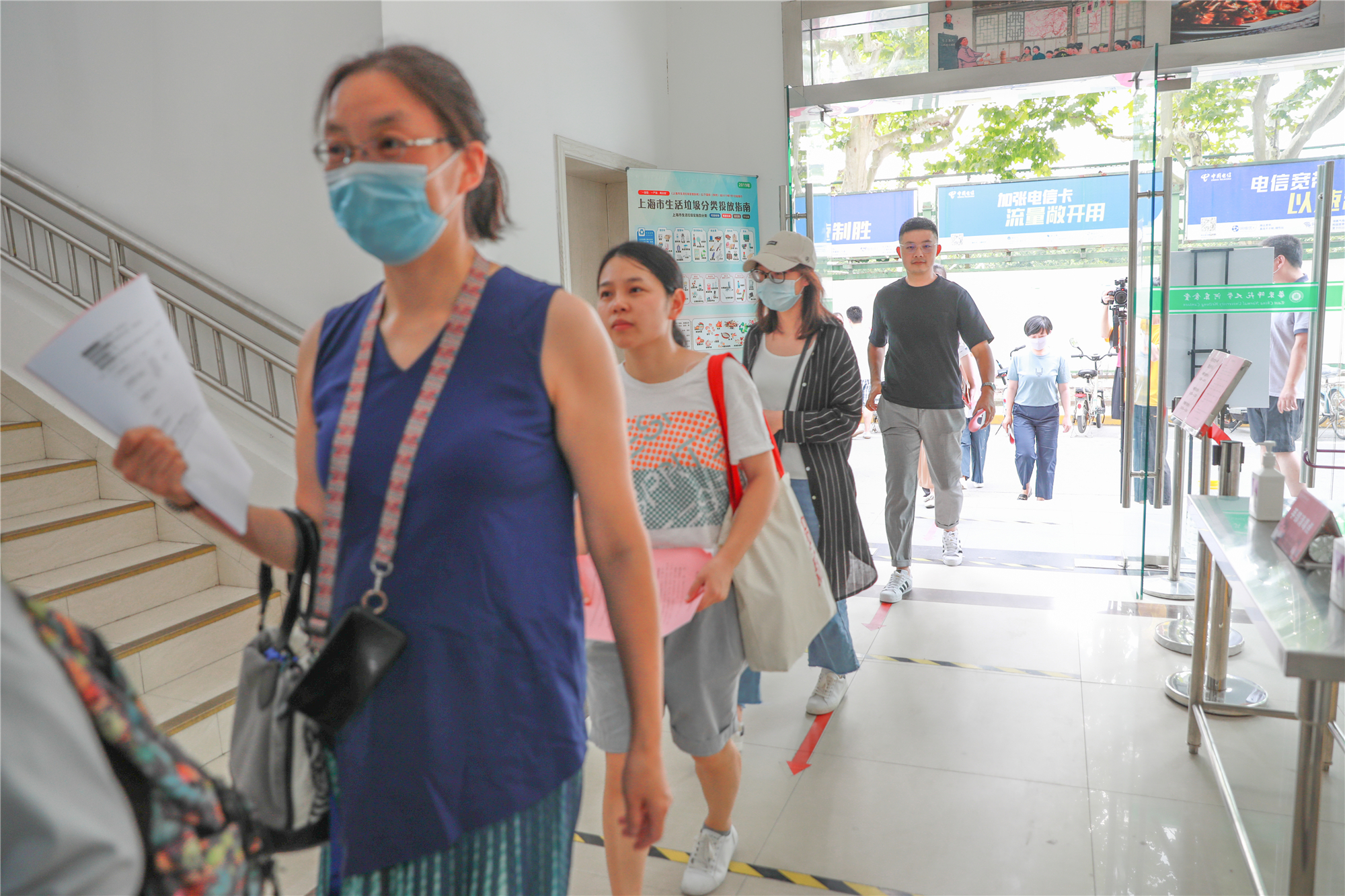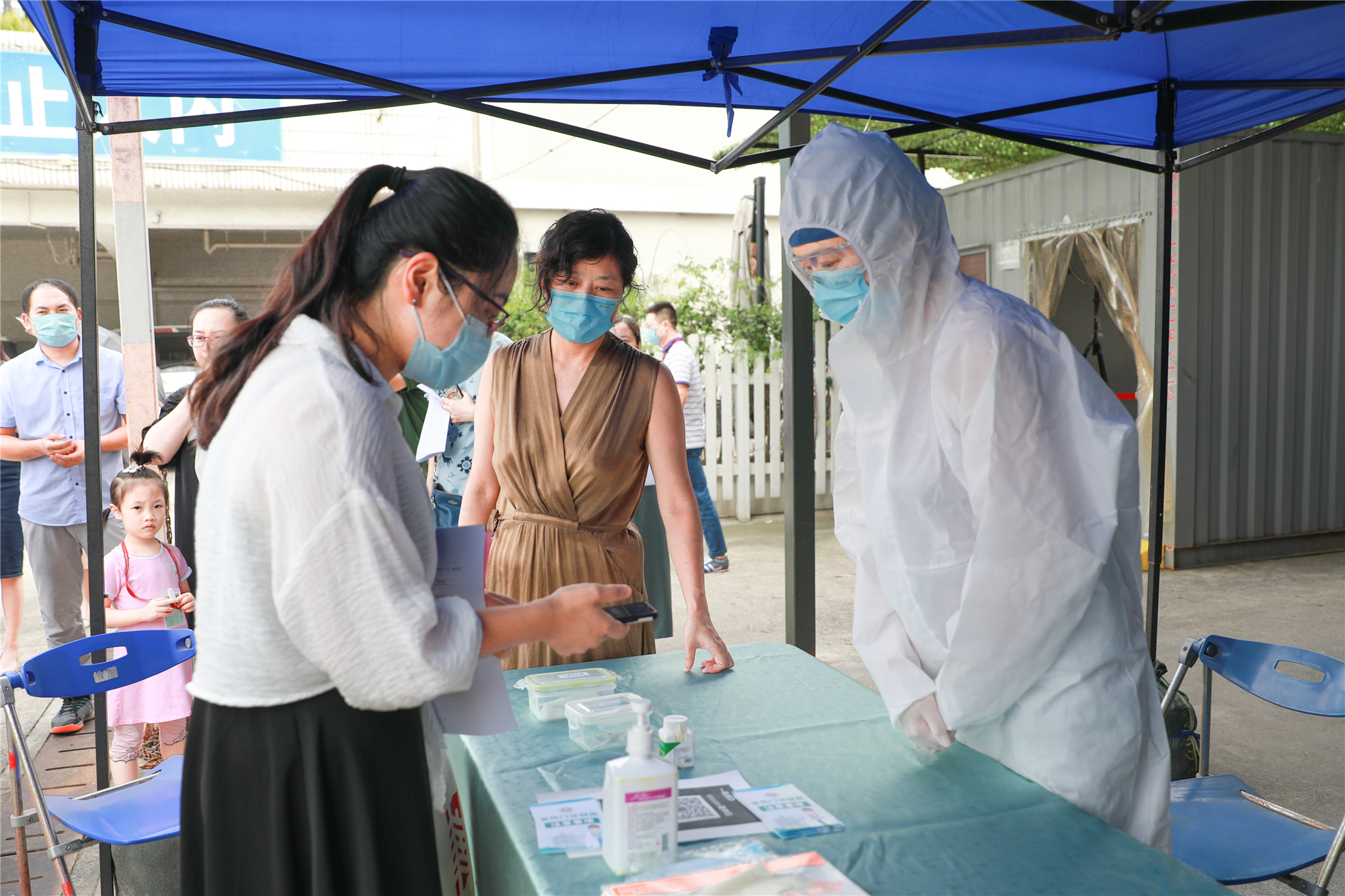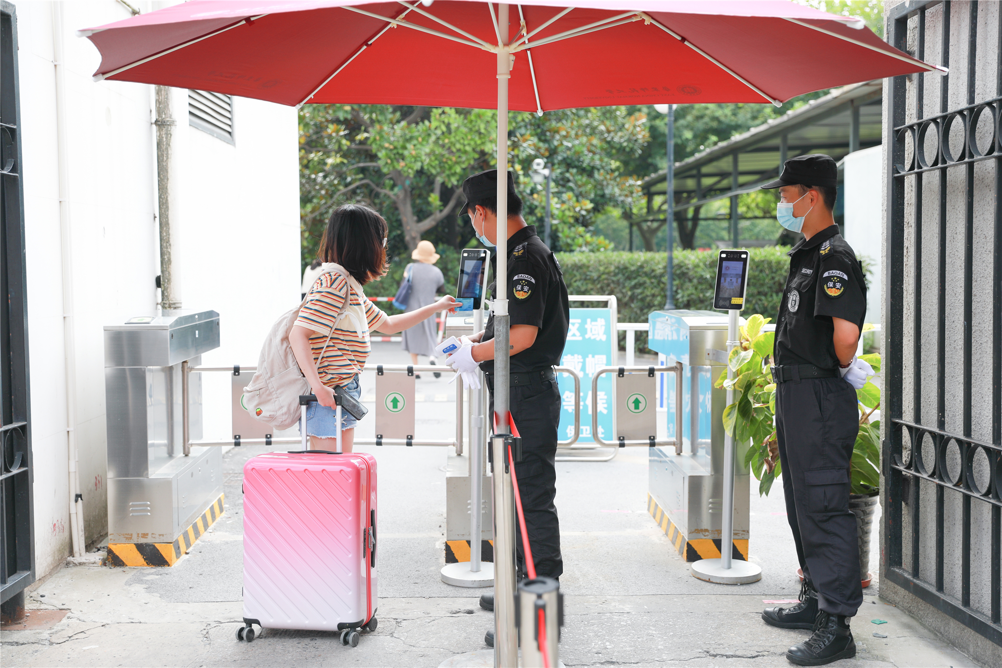 中山北路校门是本次模拟返校的演练人员经过的第一道“关卡”。在这里,安保人员组织演练人员和过往师生有序排队,依次进行健康码检查、校园卡(身份证)身份识别、体温监测,通过人行闸机。