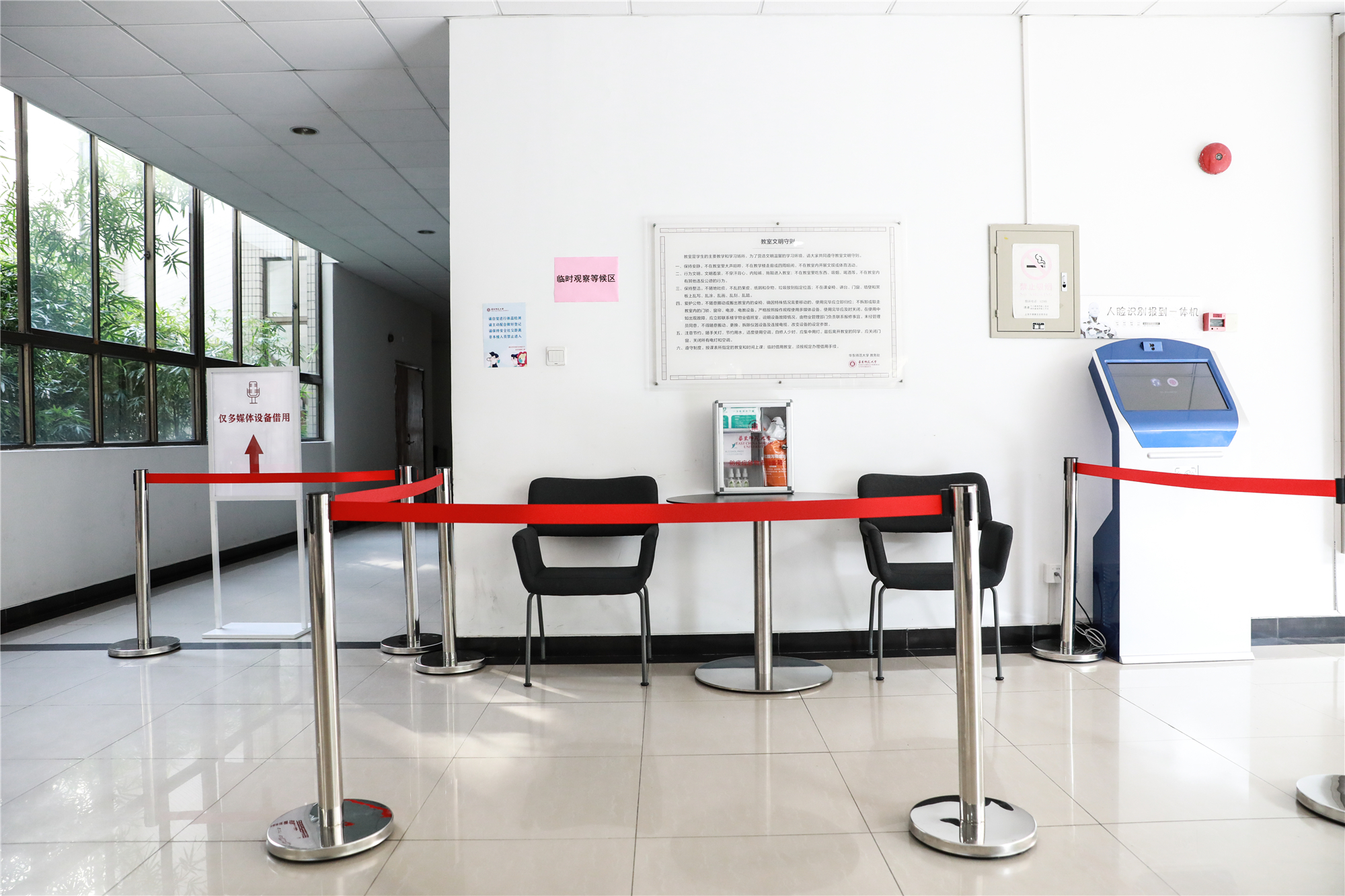 学生进入教学楼前在指定区域等候,排队保持安全距离,接受红外测温