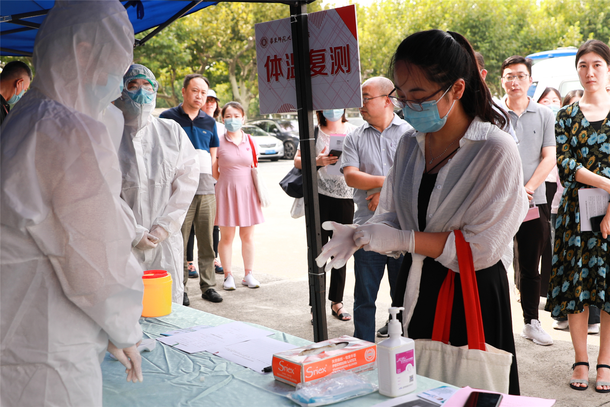 根据学校制定的老生返校、新生报到工作预案,在第一道校门“关卡”处,体温值正常的学生方可入校。如果有体温值过高的学生,将立即引导其至临时隔离观察等候区,由校医院医生进行二次测温,体温≥37.3℃的学生由校医院跟踪处理,防疫应急专车送至指定医院发热门诊,医务人员穿戴防护装备,对等候区域进行全面消毒。