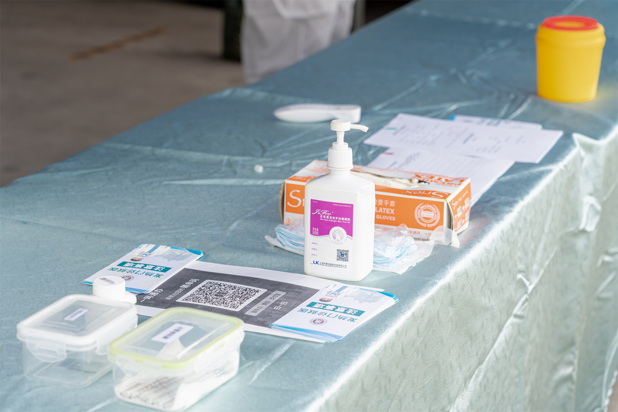 模拟体温异常者在临时隔离观察等候区等候防疫应急专车