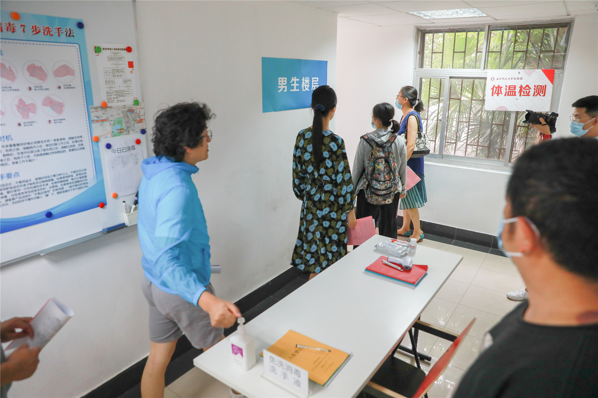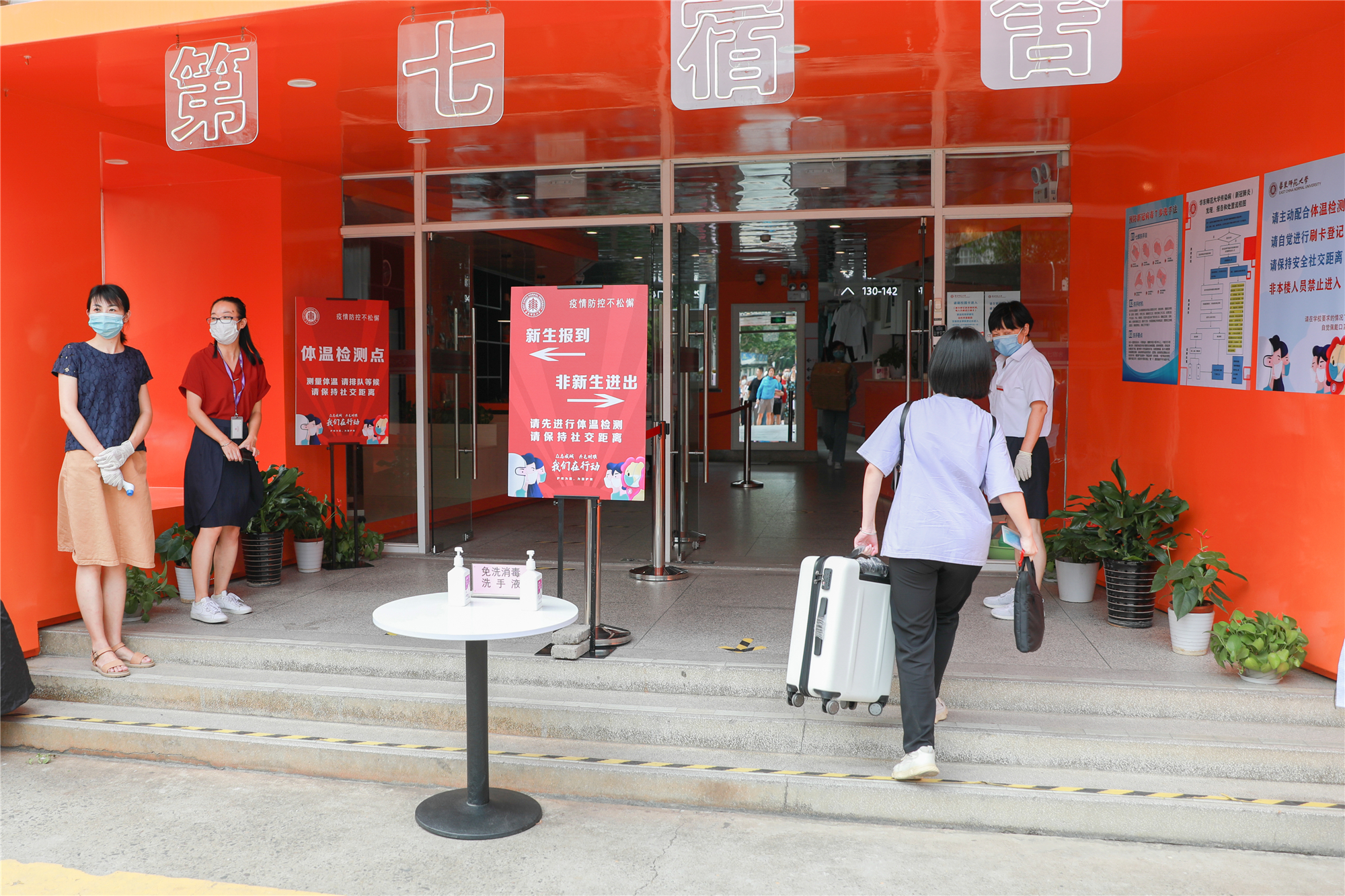 学生进入宿舍楼前在指定区域等候,排队保持安全距离,宿舍工作人员对学生进行体温测量、身份识别、登记,并发放相关须知等,提醒学生注意个人卫生和宿舍通风。有家长陪同进宿舍时,查验进校审核,测温并登记。