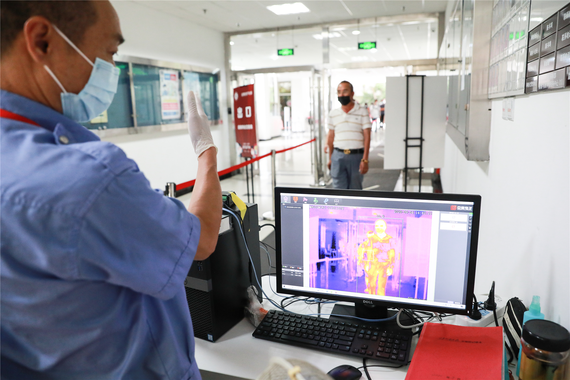 宿舍工作人员对学生进行体温测量、身份识别、登记