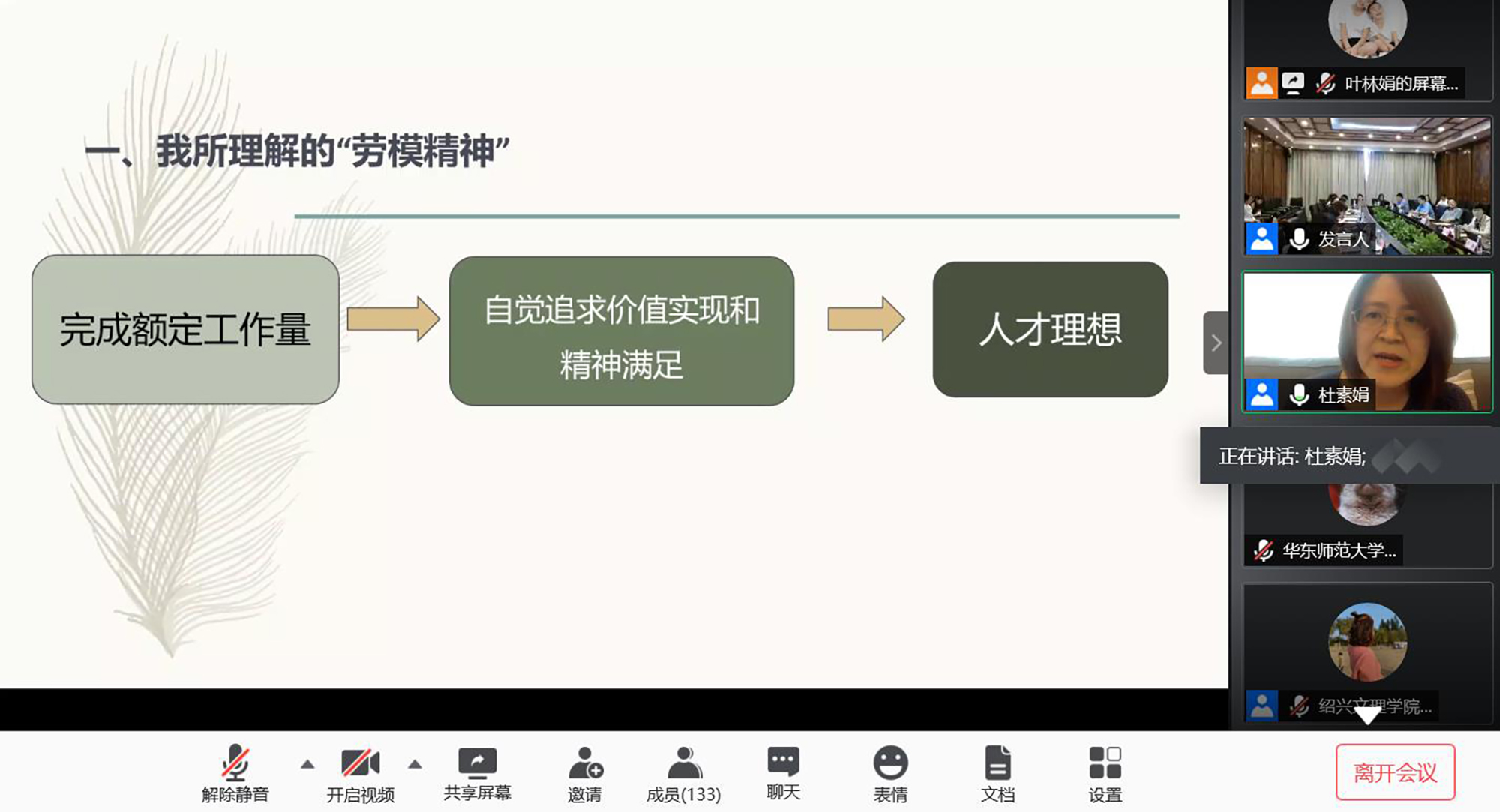 上海市育才奖、华东政法大学首届杰出教学贡献奖和教学名师获得者杜素娟教授作了题为《为人为师为学中践行劳模精神》的报告,结合自己的教书育人实践,分享了自己对“劳模精神”“合格人才”的理解,并介绍了关于教师多维育人的思考和做法。她认为所谓“劳模精神”就是不局限于一个职业、只完成额定工作量,而是自觉追求价值实现和精神满足,培养专业能力与人文能力并重的人才。