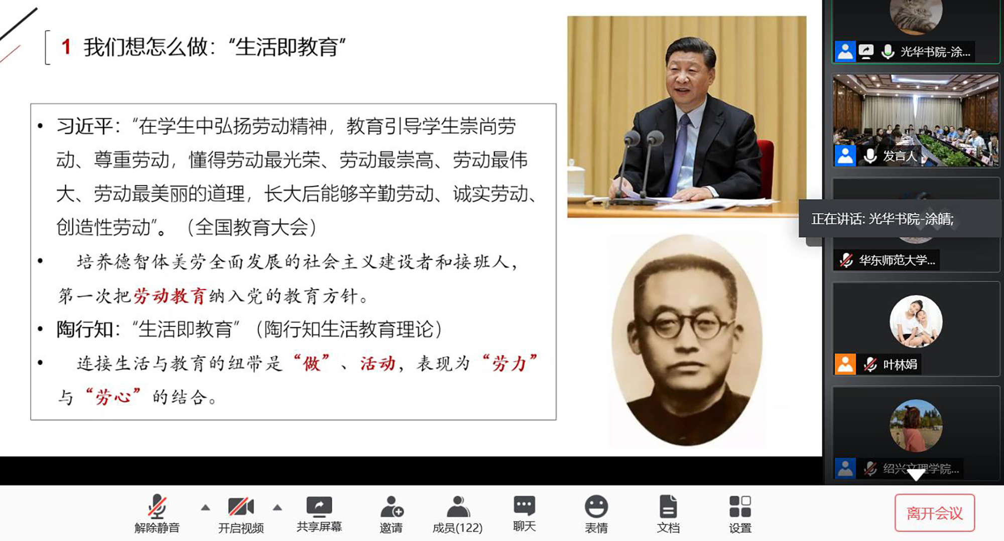为了帮助毕业生党员树立正确的劳动价值观,深刻理解劳动精神和劳模精神,顺利步入融入社会、投身劳动实践,本次活动依托长三角高校书院劳育协作平台,邀请三位专家名师在云端为毕业生党员讲授“职前一课”。江苏省政协文化文史委员会副主任、徐州市政协副主席、江苏师范大学敬文书院院长孙红旗在以《大学生劳动教育的时代价值》为题的报告中,结合自身经历,深入阐述了新时代开展劳动教育的价值和意义,并以我国劳动教育的历史、现状及问题为切入,提出要在劳动教育中充分发挥家庭、学校、社会的作用,期待大学生不负时代,在劳动中实现自己的美好理想。