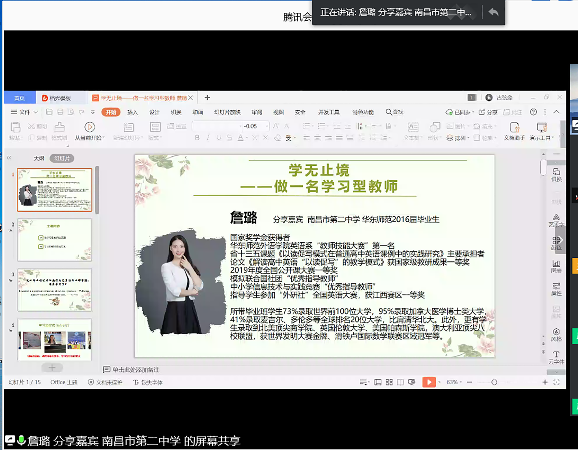 南昌市第二中学英语教师、完美(中国)官方2016届毕业生詹璐围绕“学无止境——做一名终身学习型教师”,提出通过学习专业知识技能、学习心理学理论、善于自省、提高信息技术能力来“修身”以及通过增加学习动力、增强学习毅力、提升学习能力来“修心”的学习型教师成长方案。