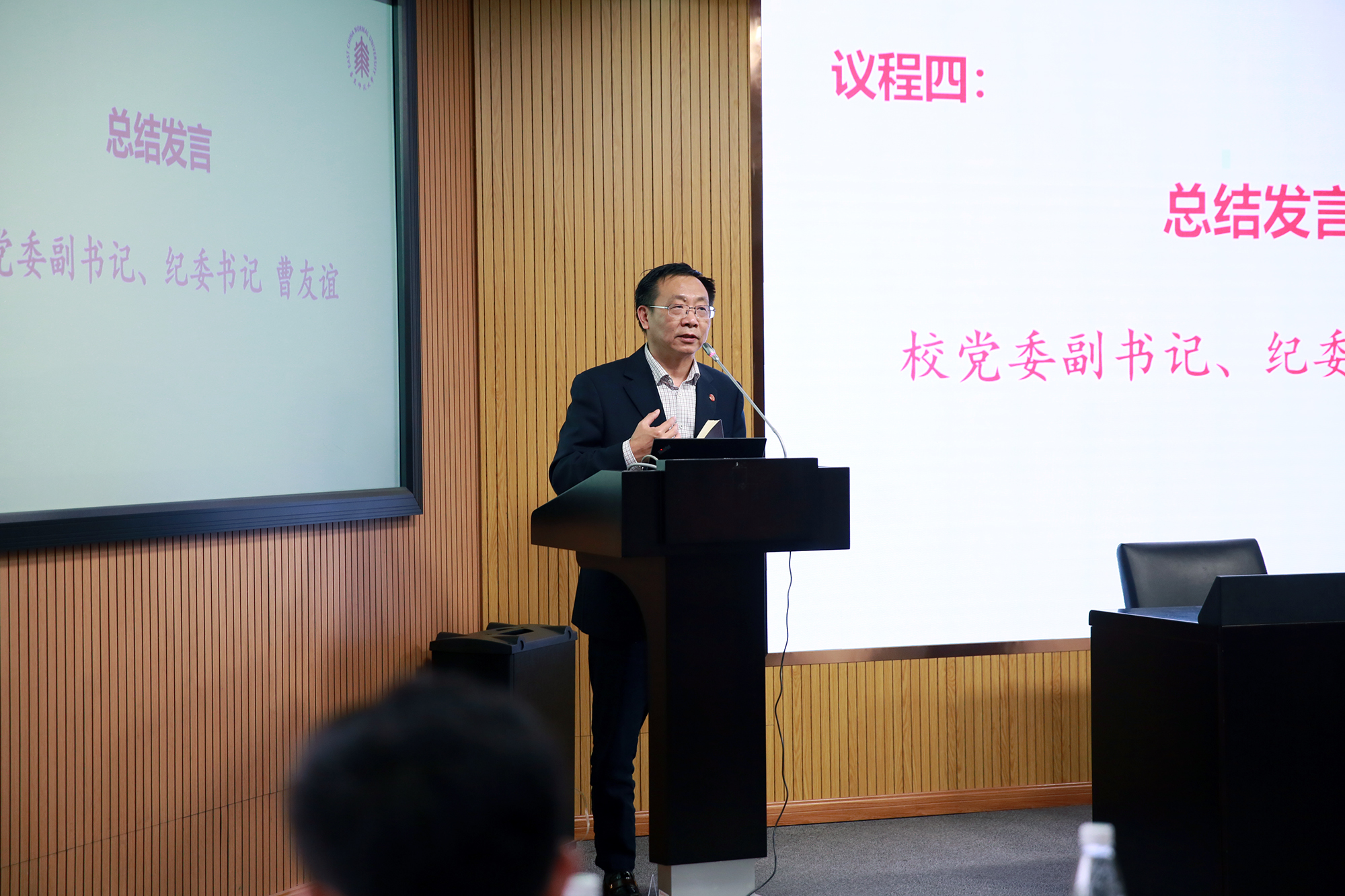最后,校党委副书记、纪委书记曹友谊作总结讲话。曹友谊提出,2020年春季学期开学工作方案已确定,希望机关各部门、各党支部按照相关时间节点,在不放松疫情防控的前提下,全面进入工作状态,管好自己的人,做好自己的事,以抓实抓细抓落地的务实工作态度,以高度的责任感和使命感,加强模范机关建设,推动学校事业改革、完善、高效。同时也希望机关各部门以即将开始的新一轮机关巡察为契机,做好迎巡准备工作,关口前移,列出问题清单,做到“未巡先改”,逐条逐项进行查摆,推动全面从严治党向基层延伸、向纵深发展。