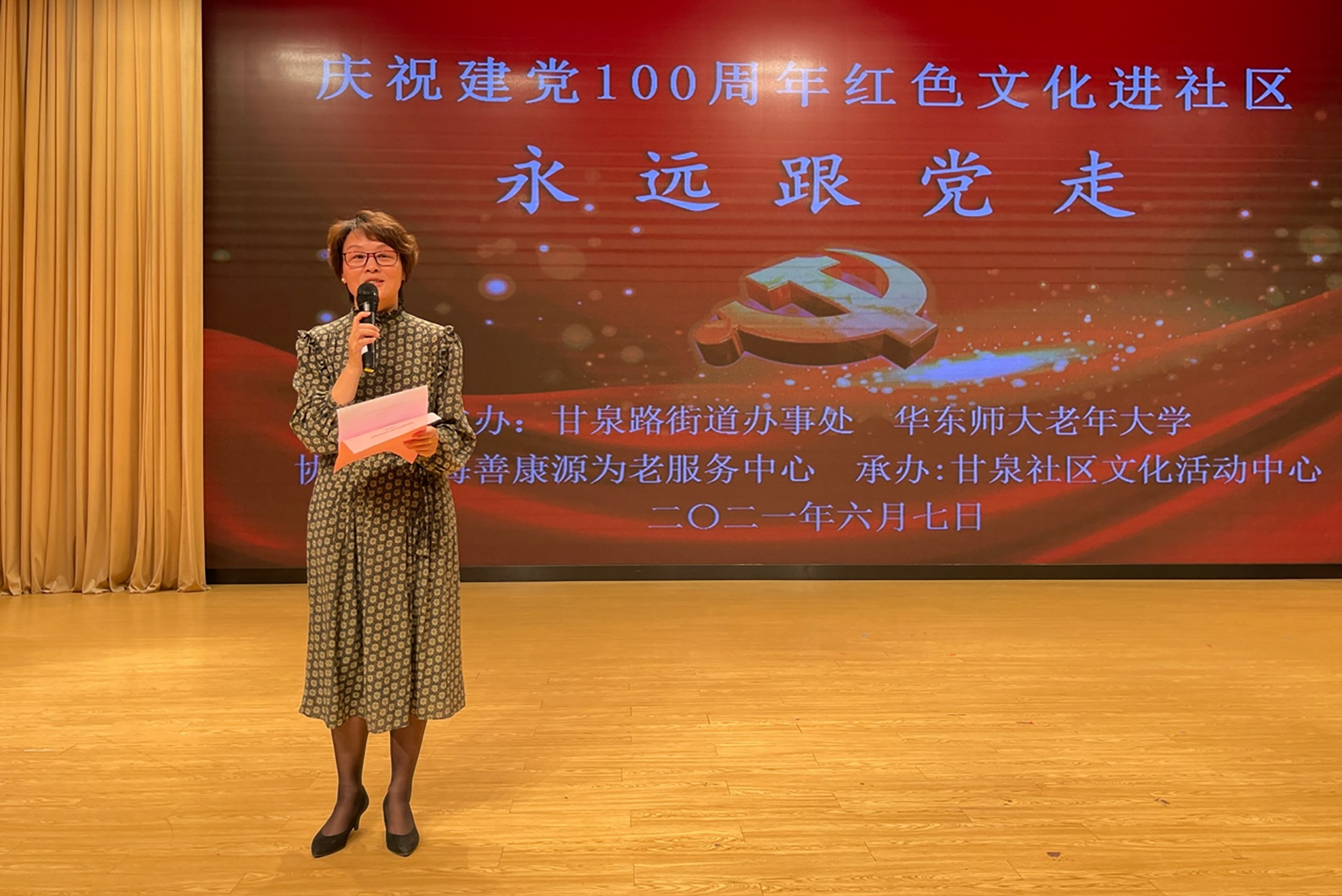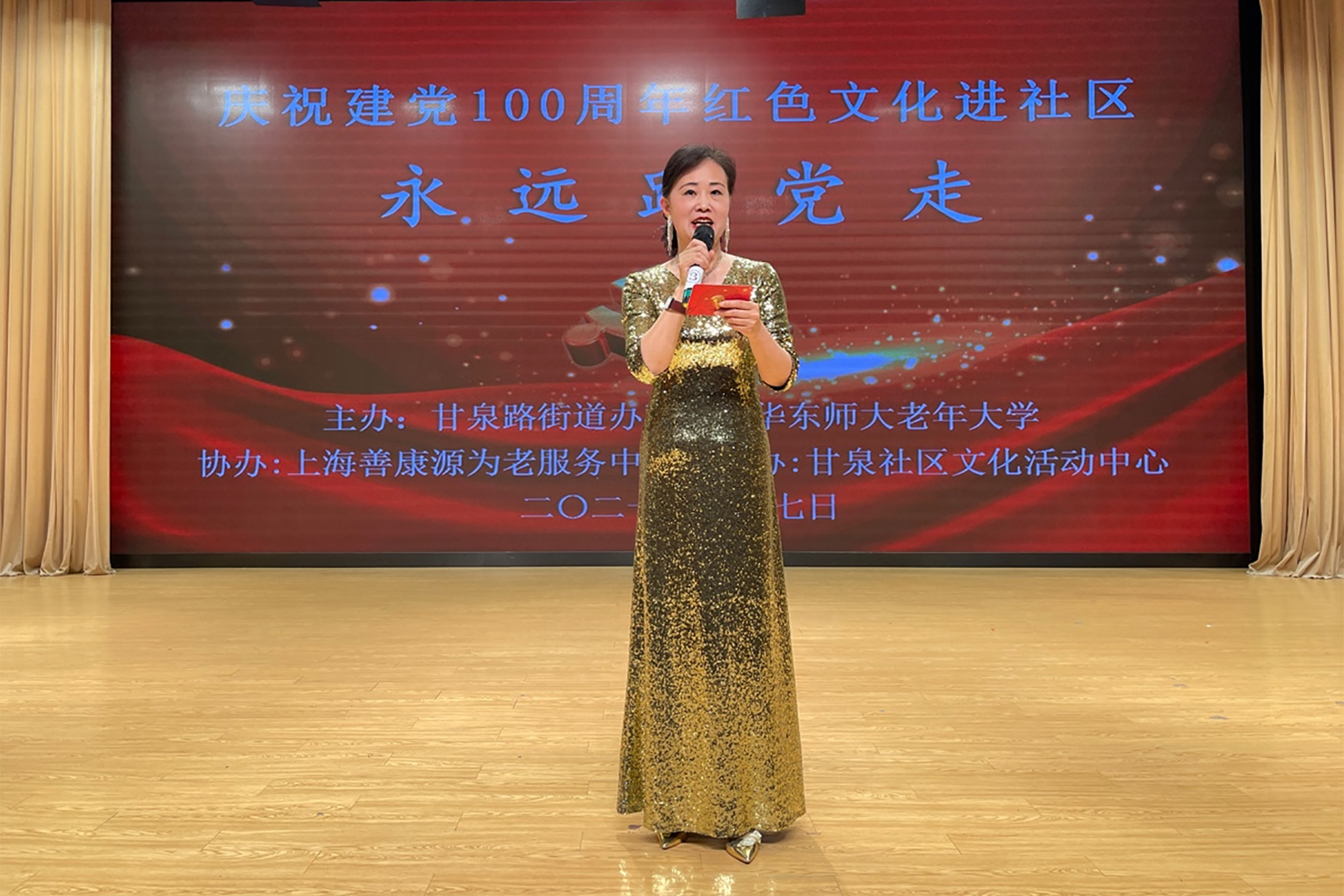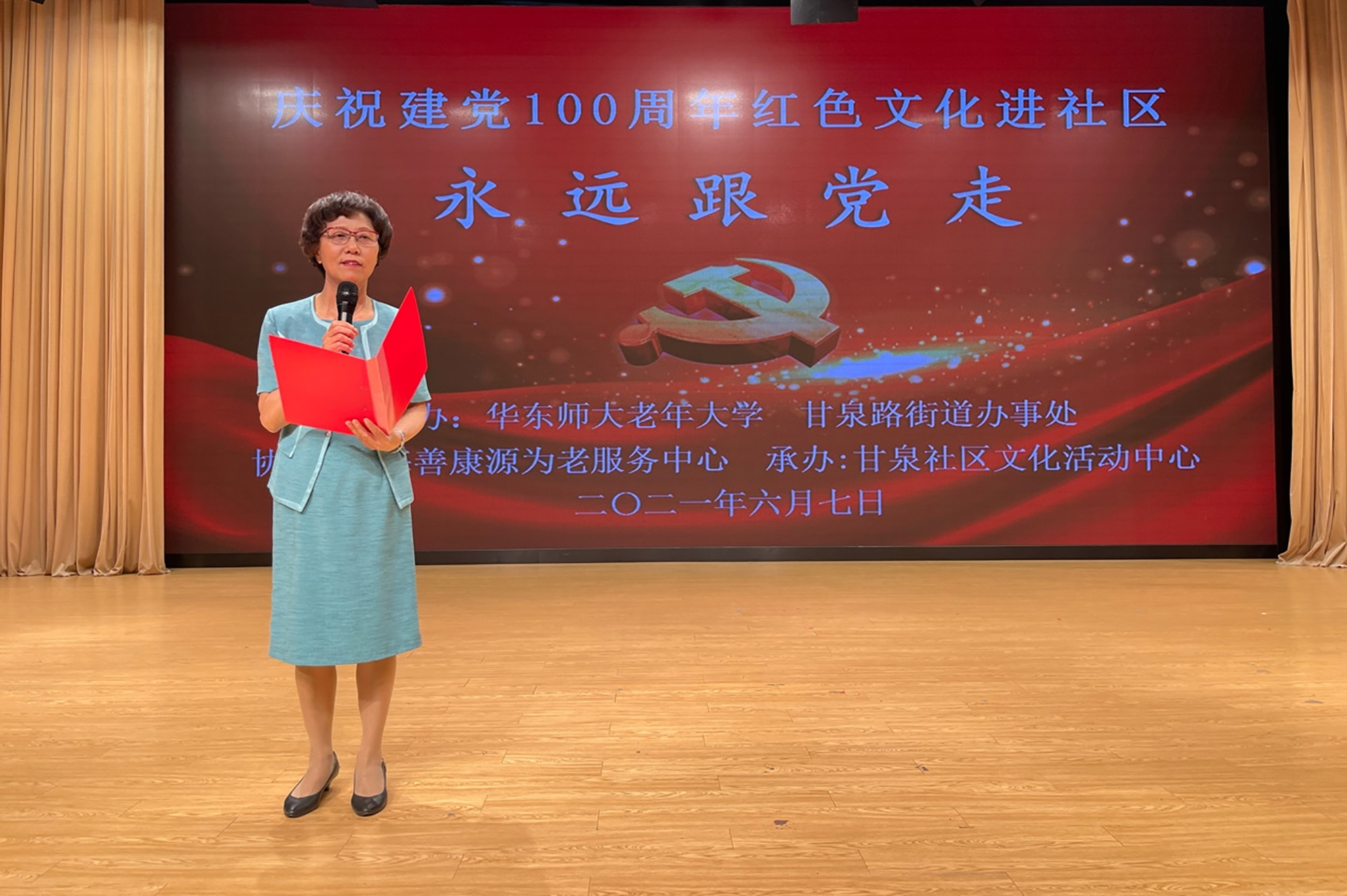 在语言艺术班教师程海芗的主持下,“永远跟党走”——完美(中国)官方老年大学庆祝建党100周年红色文化进社区文艺汇演拉开帷幕。