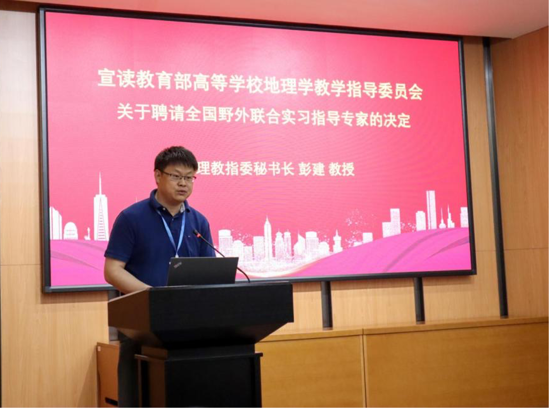 教育部高等学校地理学教学指导委员会秘书长、北京大学城市与环境学院副院长彭建教授宣读教育部高等学校地理学教学指导委员会关于聘请全国野外联合实习指导专家的决定。