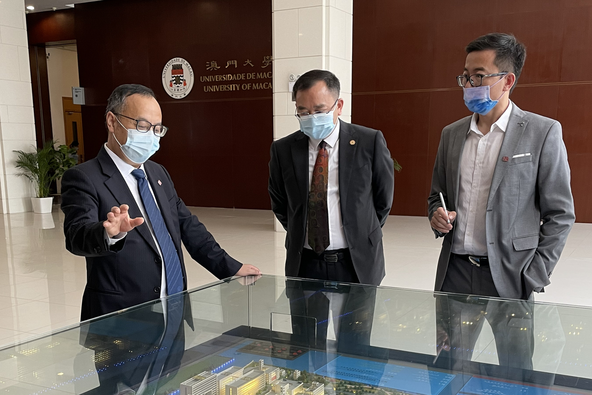 澳门大学校长宋永华(左一)向周傲英副校长介绍学校重点布局