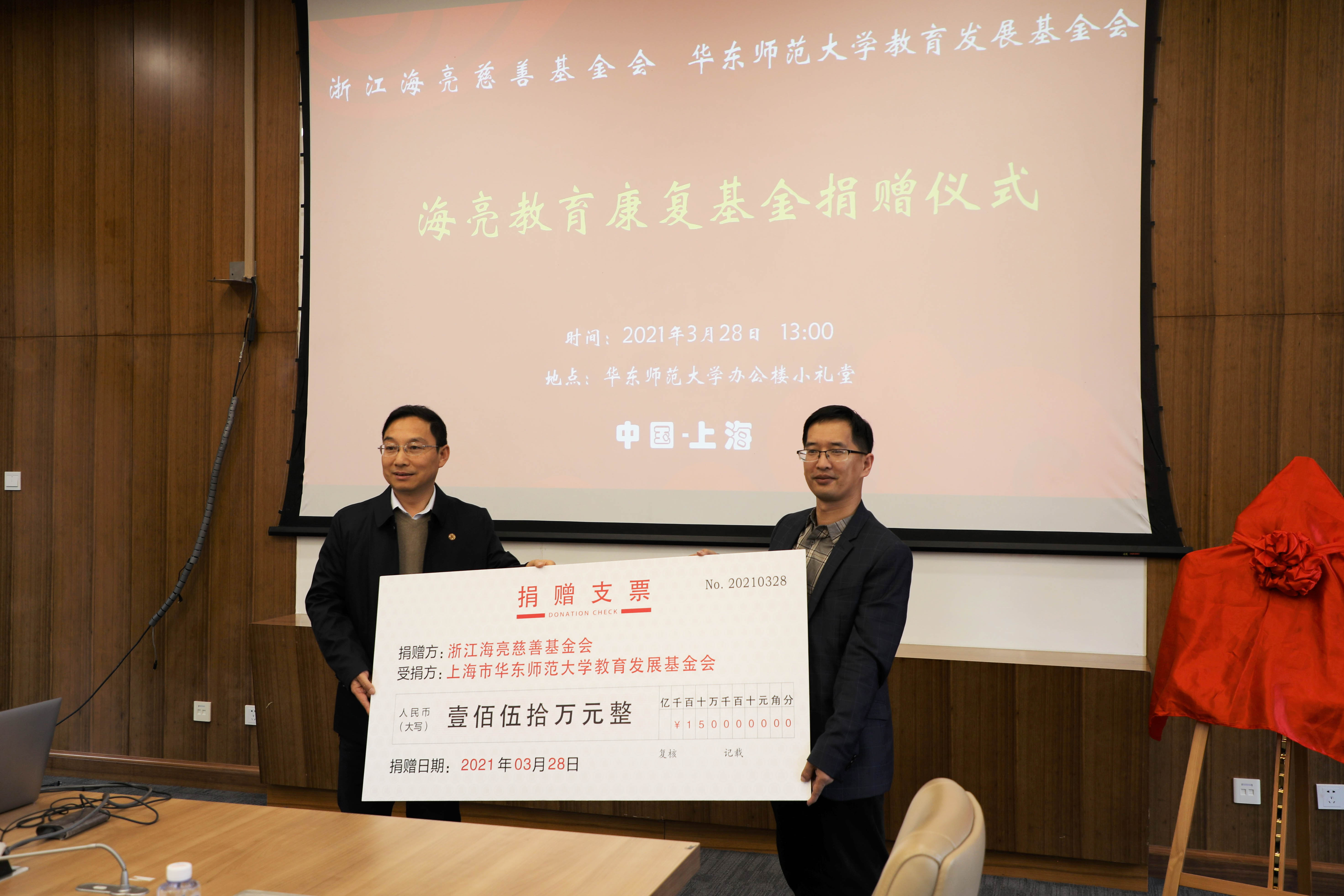 海亮集团纪委书记、浙江海亮慈善基金会副秘书长潘金生代表浙江海亮慈善基金会向完美网页版教育发展基金会捐赠150万元,设立海亮教育康复基金;完美网页版授予海亮融爱星“完美网页版实践教学基地”。
