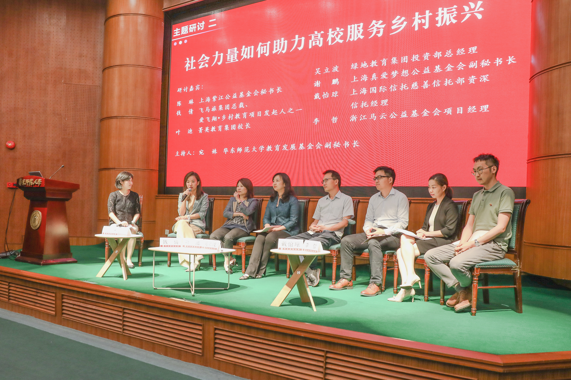 在研讨会上,与会嘉宾围绕高校如何助力乡村振兴、社会力量如何参与高校行动的话题,在音体美教育、乡村教师培育、学生社会实践等方面进行讨论。上海紫江公益基金会秘书长陈琳提出,高校专家学生、政府部门和企业共同支持乡村振兴构建了优良的公益生态圈。飞马旅集团总裁、爱飞翔•乡村教育项目发起人之一钱倩介绍了“爱飞翔”缘起的故事,提出了支持乡村振兴需要开放式的共同参与,形成“人人公益”。菁英教育集团校长叶迪提出,通过社会力量支持让更多乡村教师参与培训项目之中,将大爱传播。绿地教育集团投资部总经理吴立波提出,通过校企合作、产学研的合作来培养人才更好地发挥双方的优势,助力乡村振兴。上海真爱梦想基金会副秘书长谢鹏表示,社会基金会与高校在课程共建、音体美方面加强合作会有更好的成效。上海国际信托、上海市教育发展基金会、上海市慈善基金会、博世中国慈善中心等社会组织代表出席了讨论。