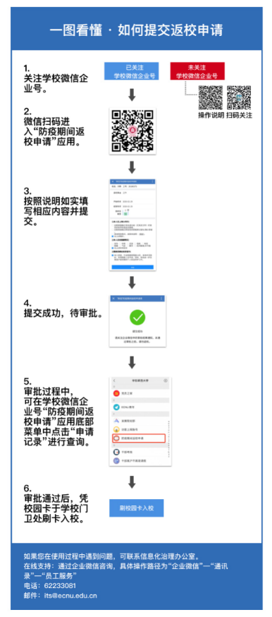 为便于学生返校申请和校园管理,学校开发了“学生返校申请”和“学生出校申请”小程序。学生只需通过“完美网页版”微信企业号,填写健康信息和返校交通信息等,即可快速完成返校申请,并可查看本申请工作流。辅导员、院系学生工作负责人和相关职能部门人员可即时根据学生状态,对学生申请做出审批意见。此外,学校还通过“出校申请”小程序加强对学生临时进出校园的管理,做到出校有报备、去向可查询、安全有提醒、数据有记录。无纸化,零接触,优流程,简程序,有记录,通过信息化手段,既提升了校园管理效率,也为学生返校提供了最大便利。