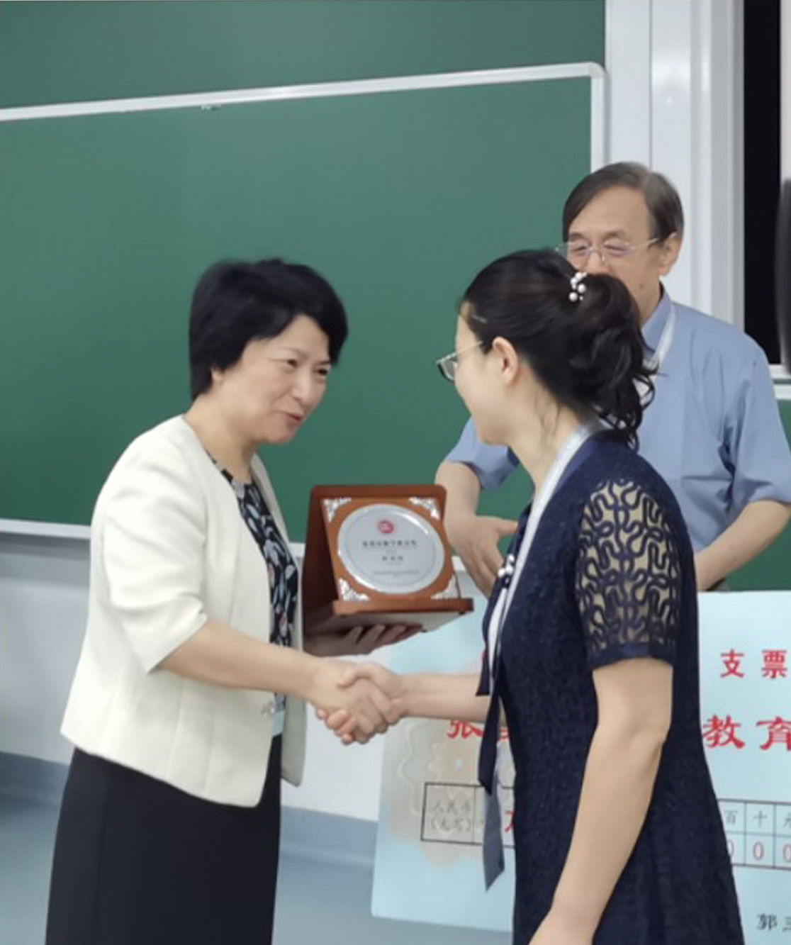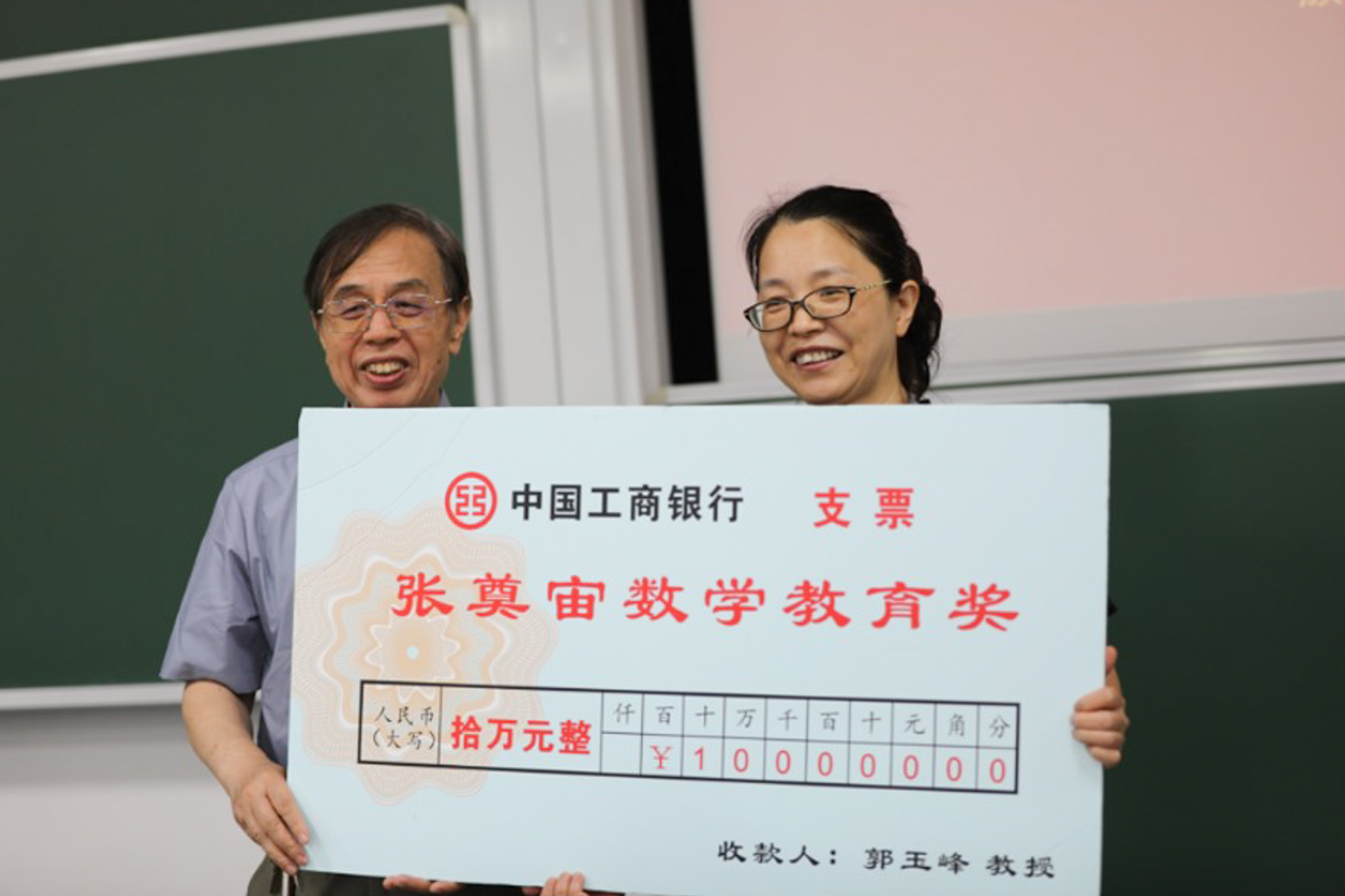 第14届国际数学教育大会主席王建磐为郭玉峰颁发奖励金