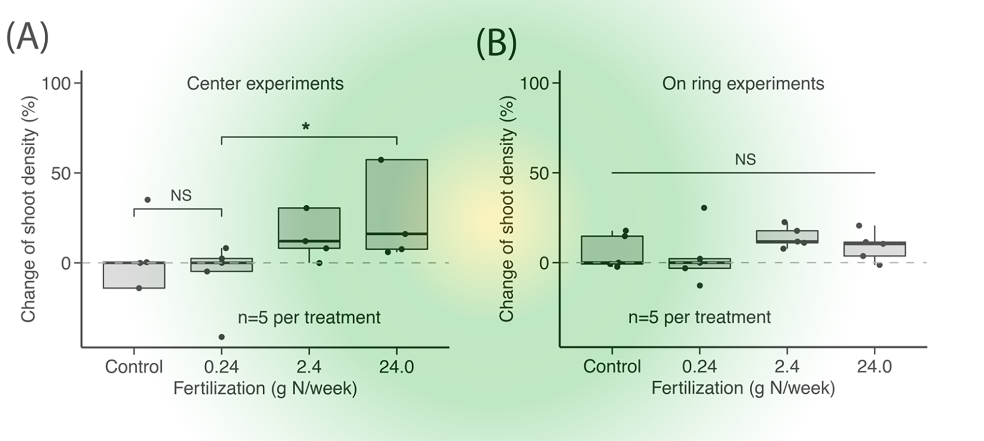 图2:分别在“精灵圈”发育早期的点状斑块中心和边缘内侧位置进行N添加控制实验,结果发现在中心位置,N添加能够显著增加植株密度(A);相反,边缘内侧没有显著变化(B)