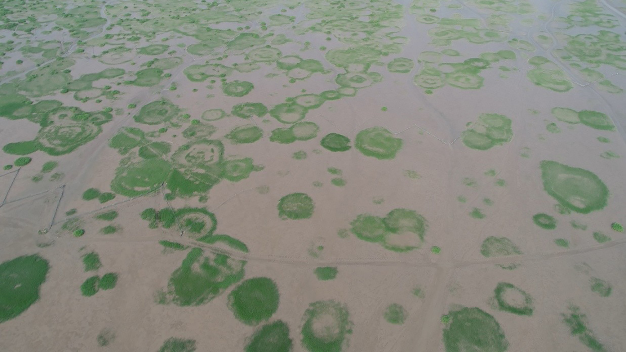 图1:上海南汇边滩盐沼湿地生态系统中海三棱藨草自组织形成的“精灵圈”(2019) (摄影:刘权兴)