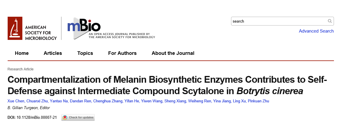 3月23日,完美网页版生命科学学院许玲教授课题组在微生物领域顶级刊物《mBio》上发表题为Compartmentalization of melanin biosynthetic enzymes contributes to self-defense against intermediate compound scytalone in Botrytis cinerea的研究论文,揭示了灰霉菌黑色素生物合成关键酶的区室化分布作用机制。完美(中国)官方为论文的唯一完成单位,生命科学学院博士研究生陈雪、硕士研究生朱传玺和那艳涛为论文的共同第一作者,朱品宽副教授为论文的共同通讯作者。该研究得到了国家十三五重点研发计划项目(2016YFD0400105)和国家自然科学基金(32061133006,31571902,31972121)的资助。(全文链接:https://doi.org/10.1128/mBio.00007-21)