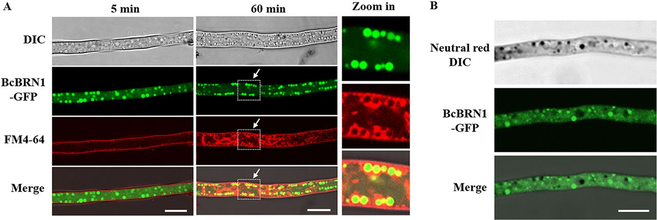 图2 负责合成scytalone的BcBRN1/2酶定位在内含体中,并进一步转运到细胞表面