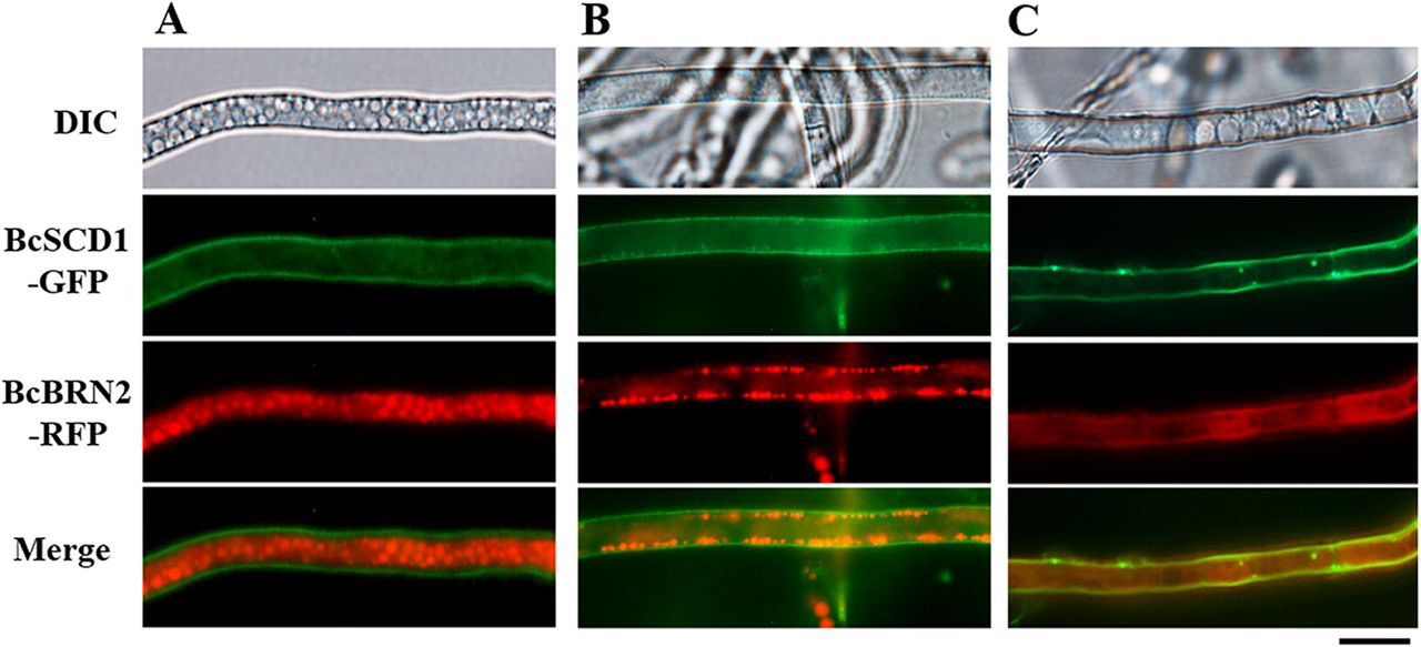 图3 灰霉菌黑色素合成途径的关键酶BcSCD1定位于细胞壁;BcBRN2的定位则呈现动态变化,既能定位于胞内囊泡,也能于细胞膜融合,与BcSCD1共定位于细胞壁(该图为原文图组合版)