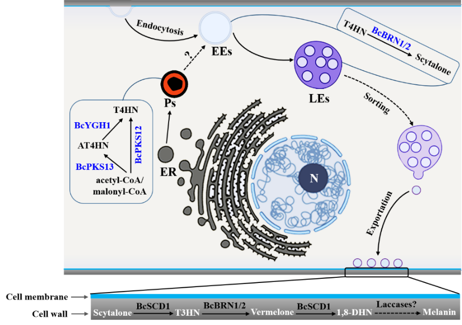 真菌黑色素是一种由酚类或吲哚聚合,并与糖类或蛋白质络合而成的高分子物质,参与真菌的抗逆性和致病性等多种生命活动。已知灰霉菌通过聚酮合酶途径合成DHN(二羟基萘)黑色素,然而关于灰霉菌黑色素的生物合成及其在细胞壁积累的细胞学调控机制仍不清楚。