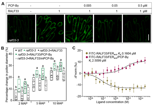 进一步还发现,柱头乳突细胞自分泌的RALF33小肽通过FER/ANJ-LLG1-ROP2-RBOHD信号通路引起活性氧产生。而PCP-Bγ小肽可以抑制RALF33小肽引起的活性氧产生(图2A),并且促进花粉在柱头的水合(图2B)。通过各种生化实验体系,发现PCP-Bγ小肽能够将FER-RALF33复合物中的RALF33小肽竞争下来,而与FER互作结合(图2C)。