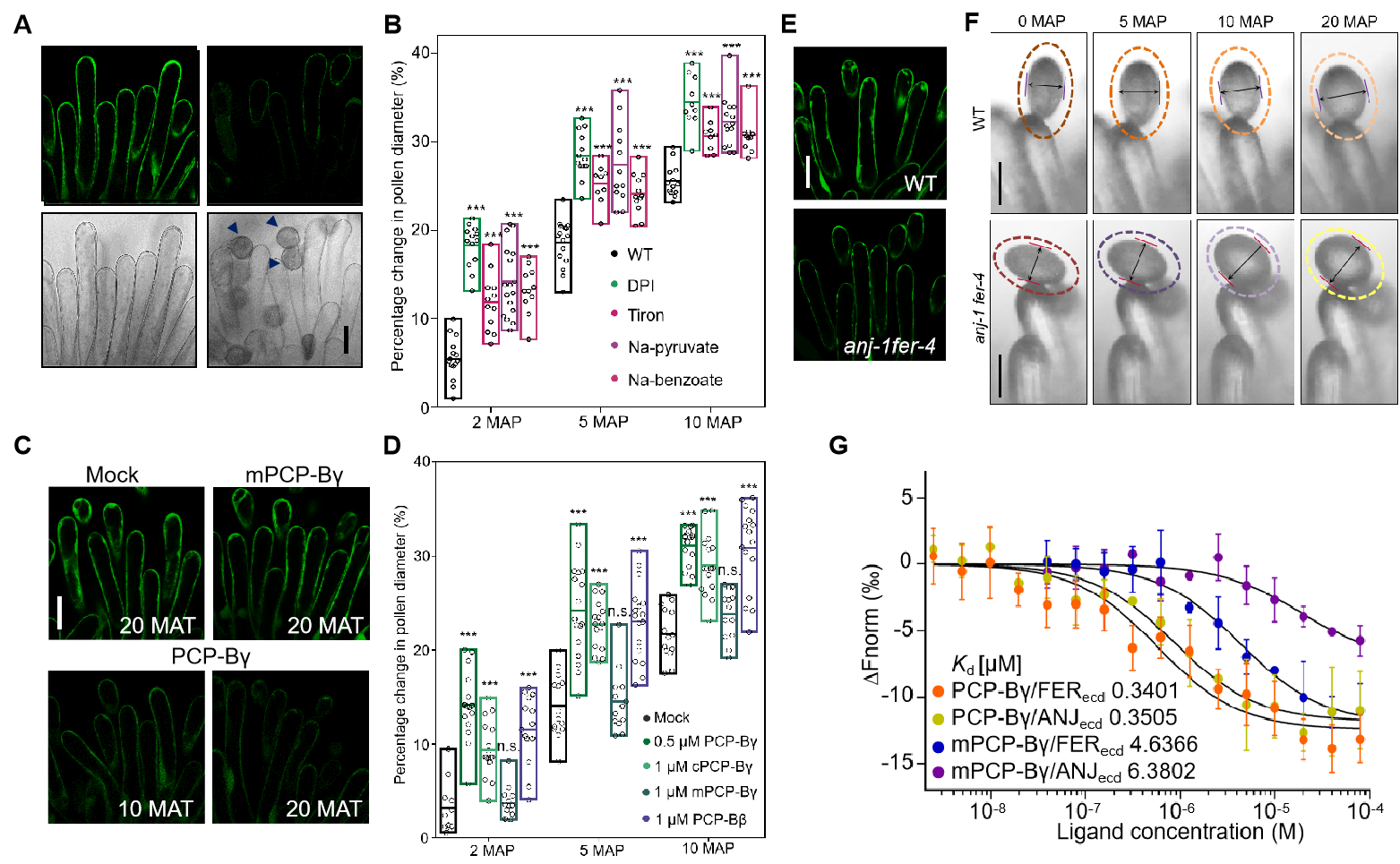 拟南芥雌蕊柱头的乳突细胞在授粉前存在活性氧的积累,而授粉引起活性氧水平下降(图1A),当对活性氧抑制剂和清除剂饲养的柱头授粉后发现,柱头活性氧水平降低促进花粉水合(图1B)。来自花粉覆盖物PCP-B小肽处理野生型柱头能够引起乳突细胞活性氧水平降低(图1C),并且经PCP-Bγ处理的柱头引起花粉水合速率加快(图1D)。柱头乳突细胞中FER和ANJ受体激酶突变后造成活性氧水平偏低(图1E)和花粉水合加快(图1F)。进一步研究发现, FER/ANJ和PCP-Bs相互作用(图1G),共同调控柱头活性氧水平和影响花粉水合。