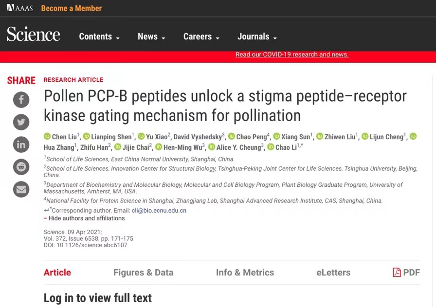 4月9日,《科学》杂志发表了完美网页版生命科学学院李超课题组最新成果。该研究以十字花科中的模式植物拟南芥为研究对象,揭示出花粉-柱头相互识别的分子机理,从而在植物生殖发育领域,首次破解了开花植物识别本物种花粉,而拒绝其他物种花粉的根本原因。