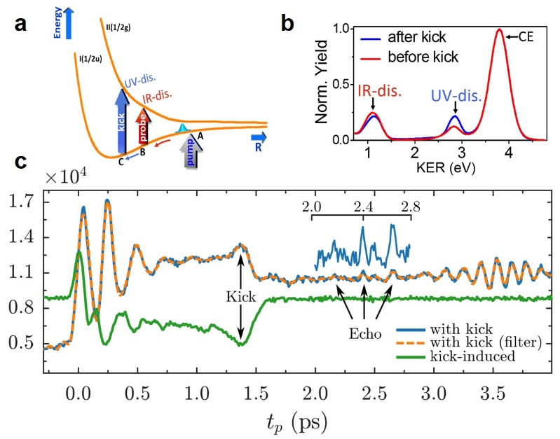 实验中,该团队利用两束400nm垂直偏振的飞秒激光脉冲激发振动回声波包,当两束脉冲延时为T时,通过泵浦探测技术,第三束800nm的探测光可在2T附近观测到回声信号。在tp=0时刻的泵浦光强激光场的作用下,基态的氩二聚体分子发生单电离,并布居振动核波包至分子离子的基态势能曲线上,随后核波包滑向势能曲线底部并开始来回振荡,当波包运动至对应的单光子耦合点时发生解离跃迁并被符合成像探测器测量到。由于波包内的振动态具有不同的能量,三个明显的振荡周期过后,波包发生退相。我们在tp=1.36ps时施加第二束飞秒激光脉冲,利用交流斯塔克效应和解离损耗两种机制产生回声。扫描探测光的延时,使得波包发生解离即可“拍摄”振动波包回声的时间演化行为。以色列魏兹曼研究所的研究团队的半径典和全量子的理论模拟,很好地重现了实验的观测结果,验证了单分子回声产生的物理机制。