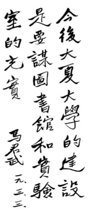 马君武有丰富的人生求学经验和革命政治历练,在大夏大学第一次全体学生与教职员讲话中,他即以“三苦精神”与师生互勉。所谓“三苦精神”,即教授要苦教,以教育为重,认真教学,不计较待遇之多寡;职员要苦干,以校务为重,切实办理,不因经费缺少而敷衍了事;同学要苦读,以学问为重,认真求学,不能有缺课等事之发生。