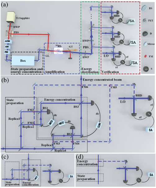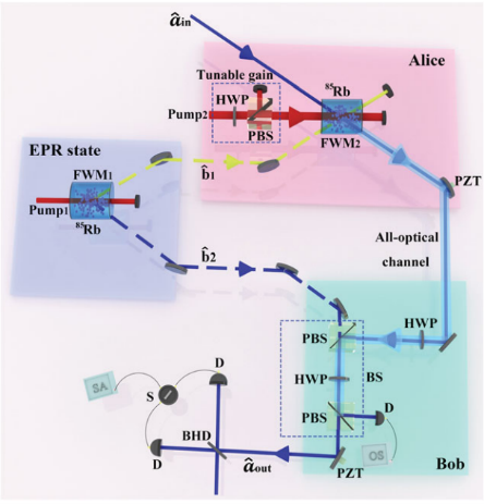 通常的量子信息系统一般只能执行单一的量子信息协议,然而量子信息任务不可能一成不变,因此开发一个兼容多种量子信息协议的多功能平台对于未来量子信息技术的实际应用至关重要。为此该团队基于原子系综四波混频过程实验实现了一种多功能全光量子态传输机,该系统可以同时实现三种不同功能的全光量子信息协议,包括全光量子隐形传态协议、部分无实体全光量子态传输协议以及全光量子克隆协议。