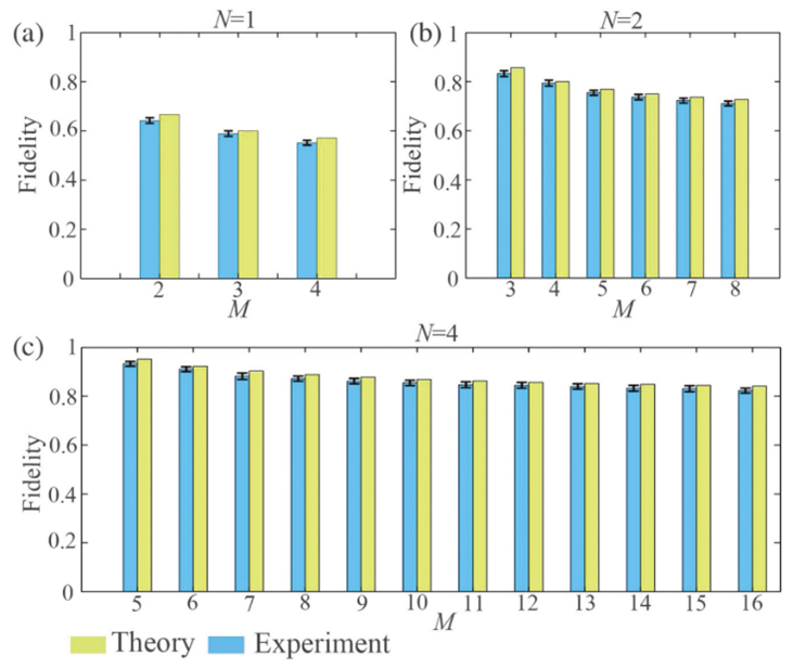 全光最优化N→M量子克隆系统示意图以及通过全光最优化N→M量子克隆系统提升量子克隆保真度的实验结果