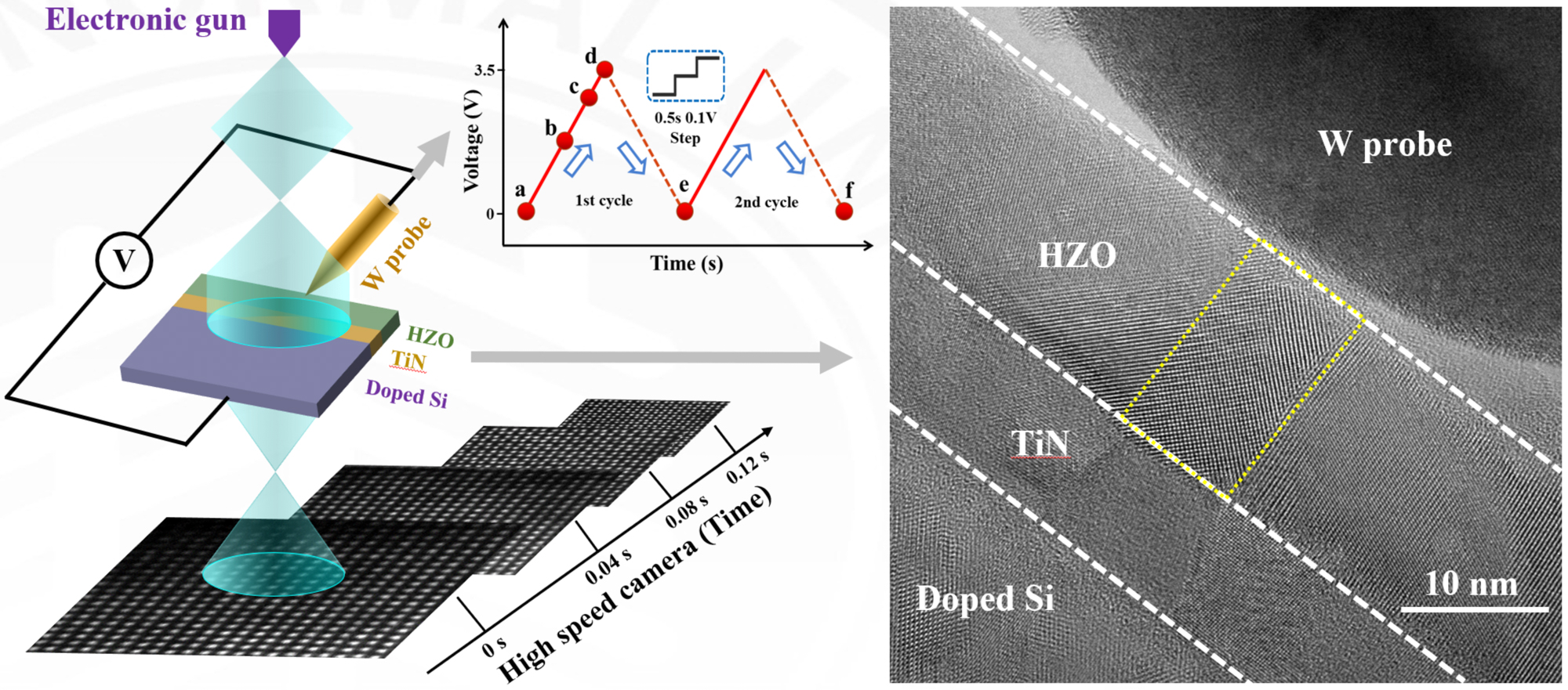 新型氧化铪基铁电薄膜具有优越的极化特性、良好的尺寸微缩性以及与CMOS工艺的高度兼容性,在逻辑器件和存储器件中有着极大的应用潜力,受到了产业界和学术界的广泛关注。然而,铪基铁电薄膜中的铁电极化起源和机理存在广泛的争议,制约了氧化铪基铁电薄膜材料和器件的应用。铪基薄膜通常采用原子层沉积方法制备,其结构十分复杂,精细的结构表征难度极大,通过原位观测来“看”铪基薄膜的结构变化是揭示其极化起源最直接和有效的研究手段。