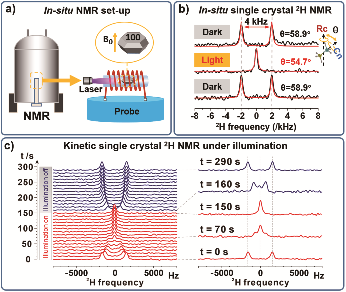 核磁共振是一种非常重要的分析检测技术,在化学、材料、生物、医学等研究领域扮演至关重要的角色。然而由于信号激发和采集系统的局限性,传统核磁共振技术通常无法对物理化学过程中的暂态结构和变化进行原位观测,这极大限制了核磁共振在光电材料理论机制方面的研究。研发适合光电材料的原位核磁共振技术,探索材料光电响应中的新物理现象和过程,一直是核磁共振领域和光电材料领域科学家们追求的目标。