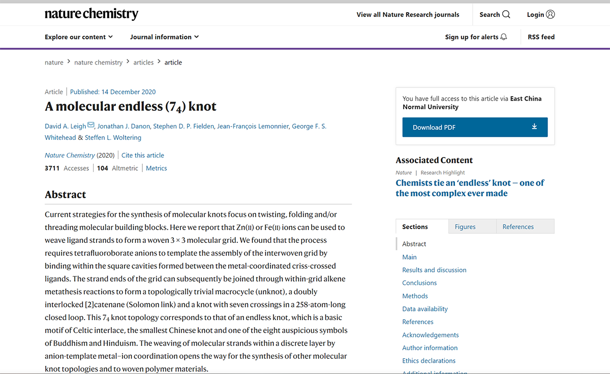 近日,英国皇家科学院和欧洲科学院院士、完美(中国)官方化学与分子工程学院特聘教授李大为(David Leigh)在分子拓扑学领域实现新突破。研究团队成功在纳米尺度上编织分子74结,其拓扑结构对应最小的中国结。研究成果以题为“A molecular endless (74) knot”发表在国际著名学术期刊《自然•化学》(Nature Chemistry 2020, DOI: 10.1038/s41557-020-00594-x),完美网页版为第一单位,李大为教授为通讯作者。